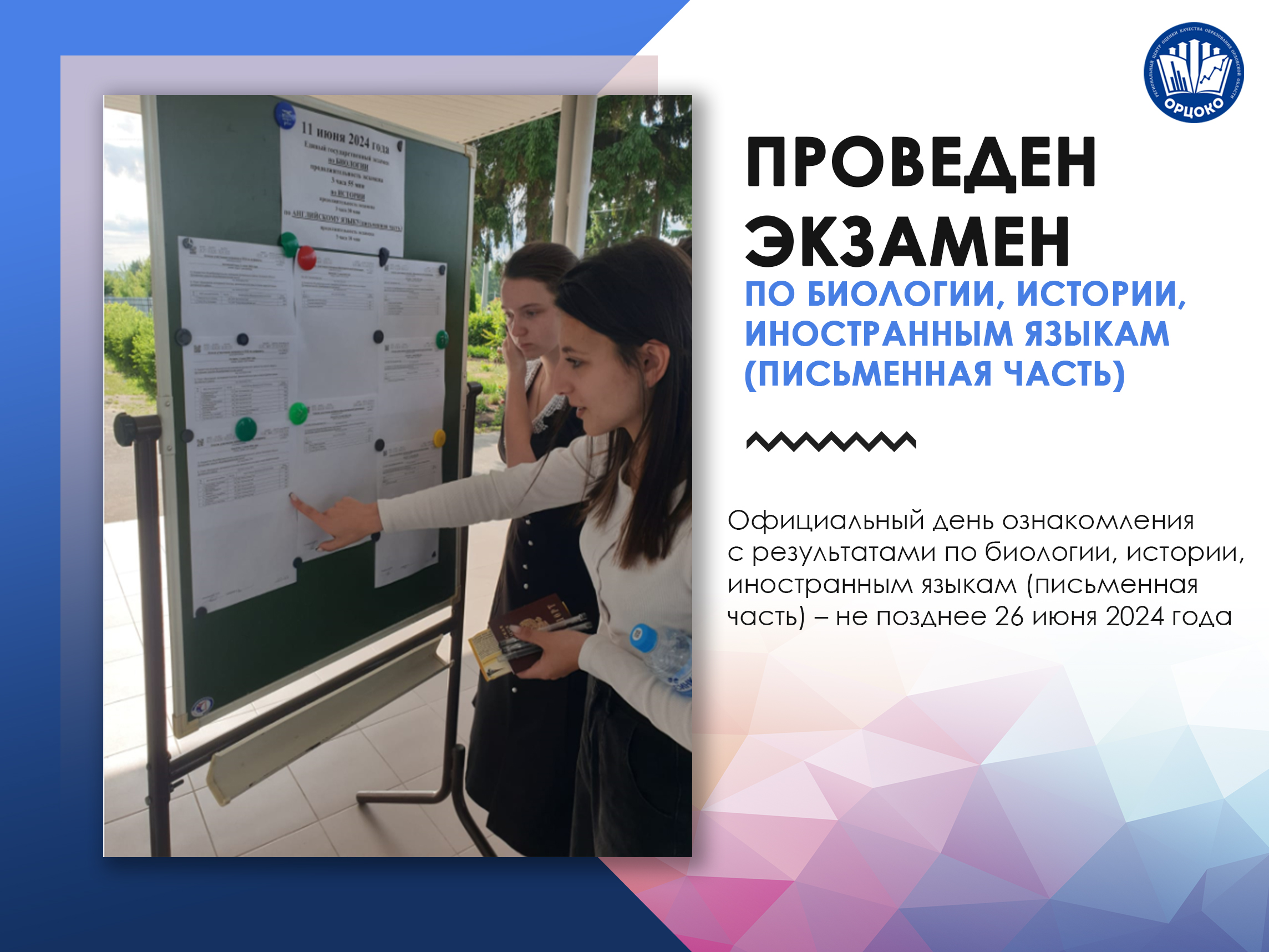 Официальный день ознакомления с результатами по биологии, истории, иностранным языкам (письменная часть) – не позднее 26 июня 2024 года.
