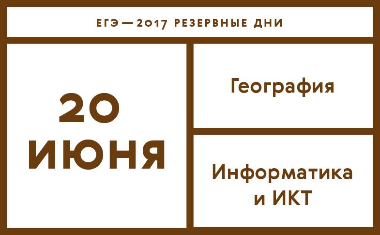 Согласно расписанию проведения единого государственного экзамена 2017 года, 20 июня начинаются резервные дни для сдачи ЕГЭ: в этот день проходят экзамены по географии и информатике и ИКТ.