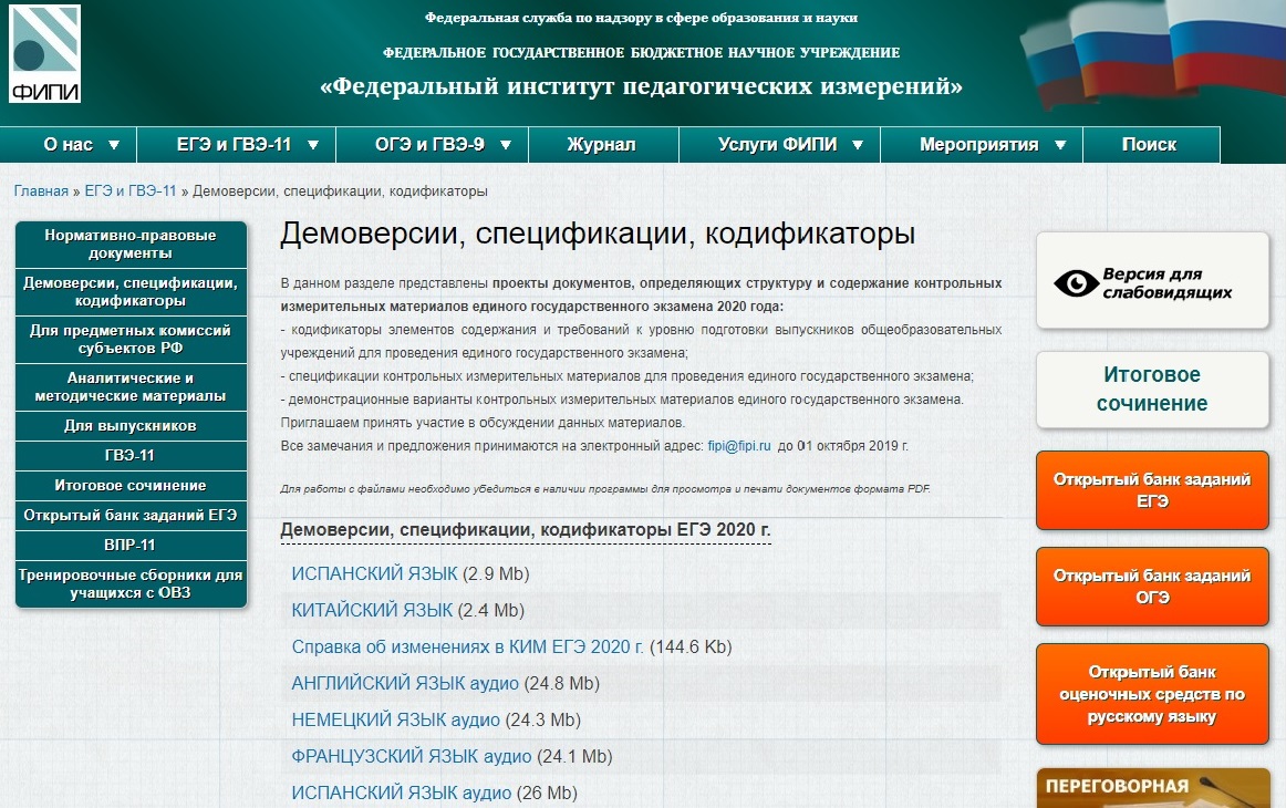 Данные документы являются основой для составления экзаменационных материалов и ежегодно публикуются для экспертного обсуждения до начала учебного года. С их помощью будущие участники ЕГЭ-2020 и их преподаватели могут также составить представление о том, что их ждет на экзаменах в новом учебном году.