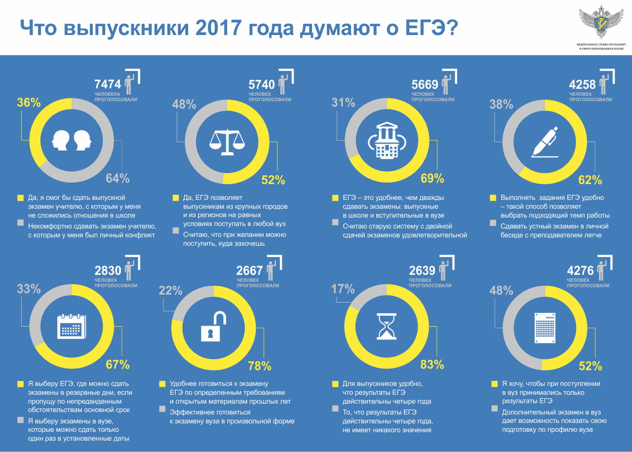 Федеральная служба по надзору в сфере образования и науки подвела итоги опроса, который проводился на официальном портале ЕГЭ среди выпускников и учащихся школ, чтобы узнать их мнение об итоговой аттестации. Опрос проходил с 9 по25 июня, участие в нем приняли около 7,5 тысяч посетителей портала.