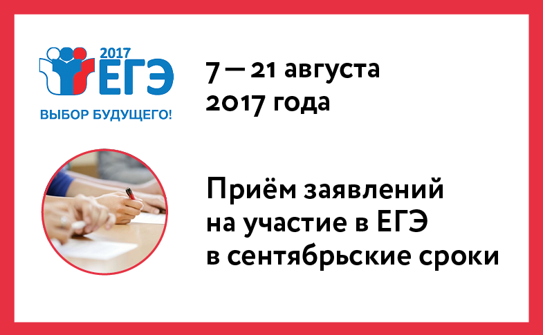Прием заявлений на участие в государственной итоговой аттестации по образовательным программам среднего общего образования (далее – ГИА) в сентябре осуществляется с 7 по 21 августа 2017 года. Местами регистрации для прохождения ГИА в дополнительный (сентябрьский) период 2017 года являются образовательные организации, в которых обучающиеся, не прошедшие ГИА, восстанавливаются для ее прохождения.