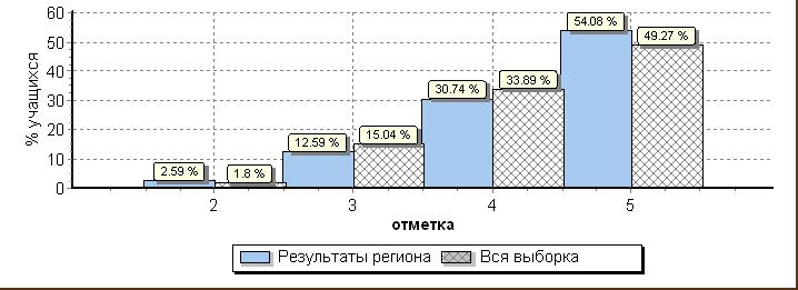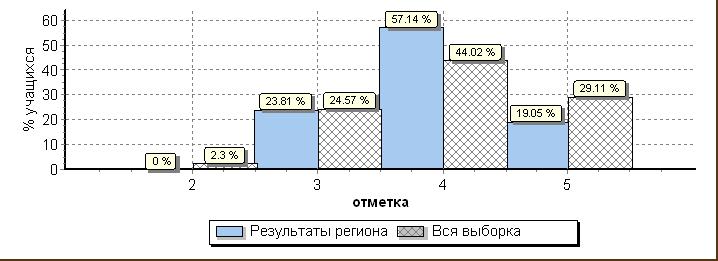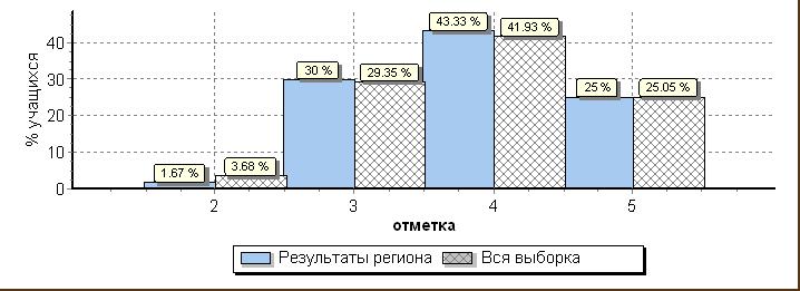Выполнение всероссийской проверочной работы по немецкому языку – выбор 60 обучающихся региона. На рисунке 3 изображена общая гистограмма отметок, полученных участниками ВПР Орловской области, в сравнении с результатами обучающихся всей страны.