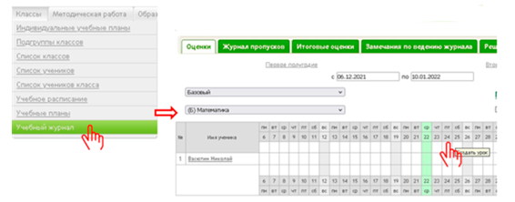 Для правильного оформления занятий в первом классе в электронном журнале в виджете «Классы» на вкладке «Учебный журнал» необходимо создать урок согласно учебному расписанию.