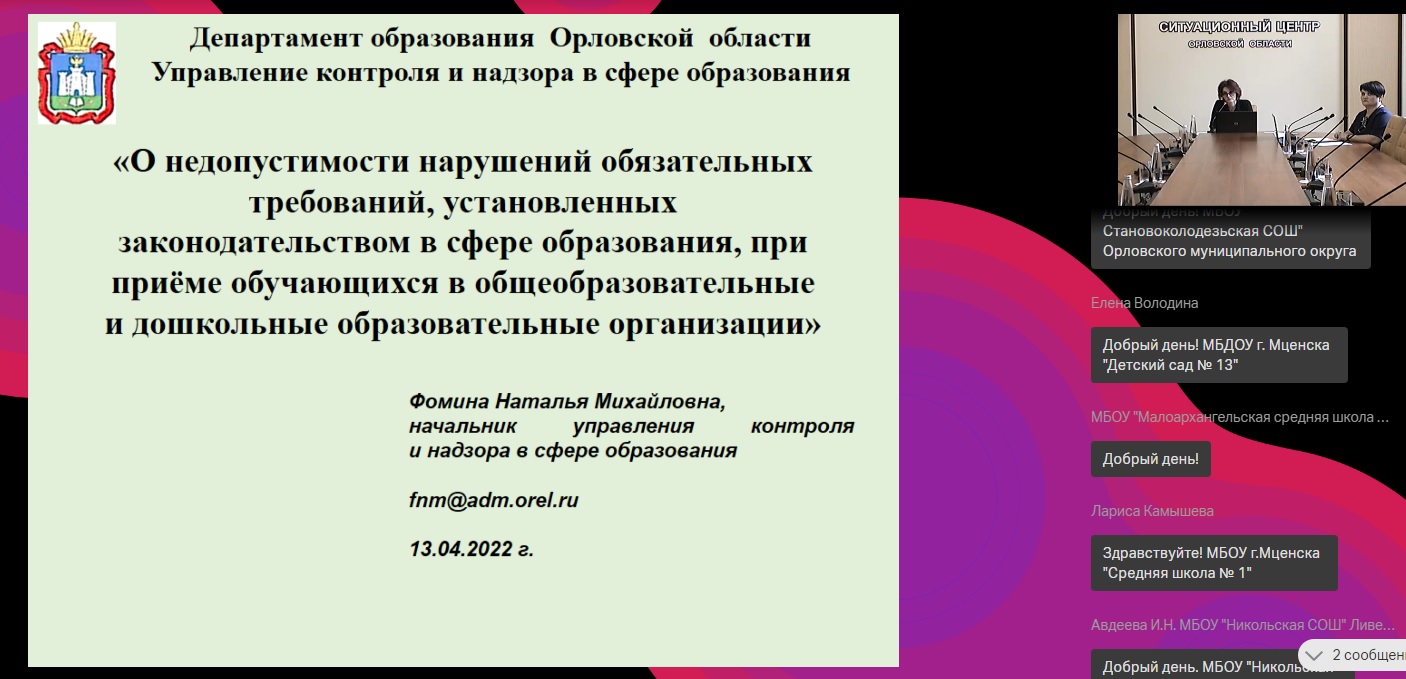 Сегодня, 13 апреля 2022 года, состоялась очередная серия совместных онлайн-совещаний, проводимых Департаментом образования Орловской области, для представителей муниципальных органов управления образованием и руководителей образовательных организаций. На вебинаре были рассмотрены вопросы приема в образовательные организации Орловской области.