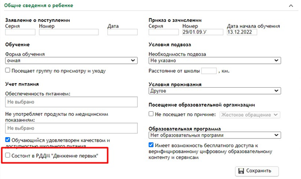 Для заполнения признака РДДМ «Движение первых» в Виртуальной школе необходимо: