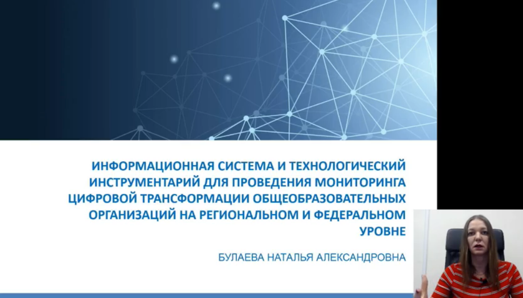 В ходе семинара, проведенного в дистанционном формате, Булаева Наталья Александровна — эксперт ООО «Верконт Сервис», президент Союза «Профессионалы в сфере образовательных инноваций», к.эк.н., рассказала о технологическом инструментарии и системе поддержки мониторинга цифровой трансформации, определила результаты мониторинга цифровой трансформации школ по итогам 2020 года, отметила необходимость высокого уровня оснащения школ компьютерной техникой и использования цифровых технологий: электронного журнала, электронного дневника, платформ для дистанционного обучения.
