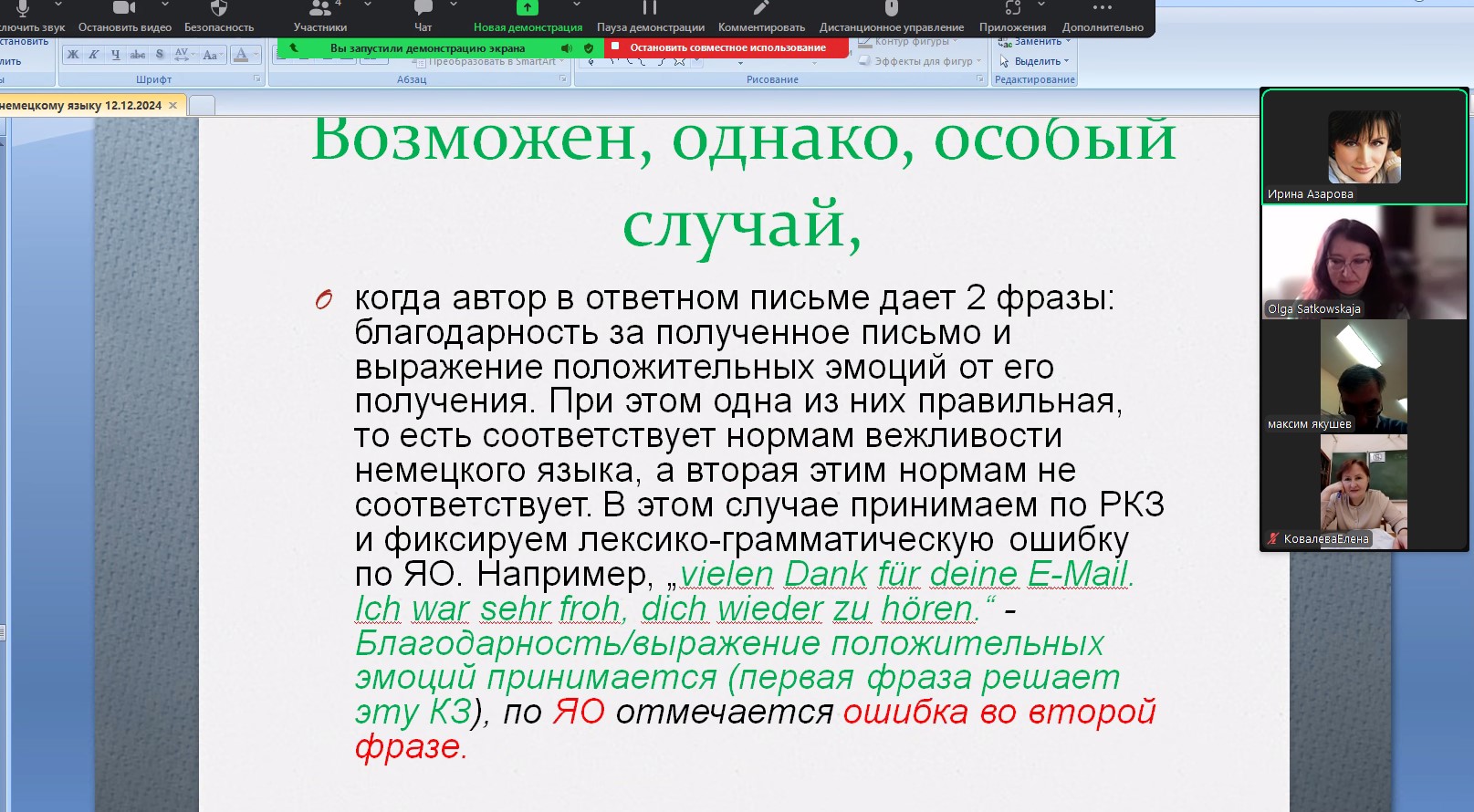 Председатель предметной комиссии по немецкому языку, кандидат филологических наук О. Н. Сатковская отмечает: «Современные процедуры оценки качества находят отражение в практике подготовки экспертов. В ходе оценивания письменных работ отрабатываем навыки определения нарушения логических связей, классификации логических ошибок с целью повышения объективности оценивания развернутых ответов».