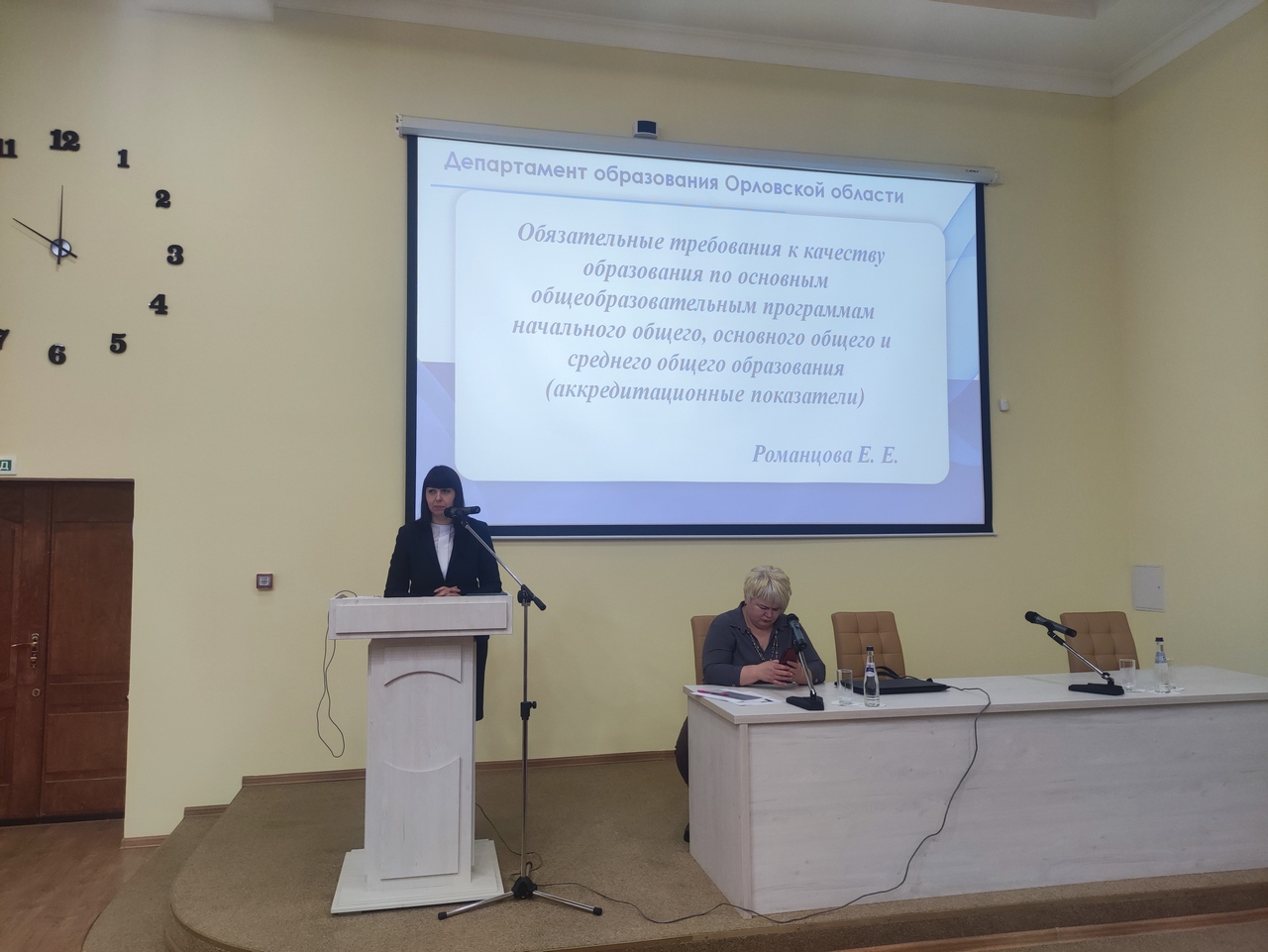 Вопросы обновления федеральных государственных стандартов, содержания образования стали темами выступлений заместителя начальника управления – начальника отдела контроля в сфере образования и надзора в сфере образования Департамента образования Орловской области Романцовой Е. Е. «Обязательные требования к качеству образования по основным образовательным программам начального общего, основного общего и среднего общего образования (аккредитационные показатели)» и начальника отдела государственной аккредитации и лицензирования управления контроля и надзора в сфере образования Департамента образования Орловской области Дозмолиной А. А. «Установление соответствия основных образовательных программ общего образования федеральным государственным стандартам».