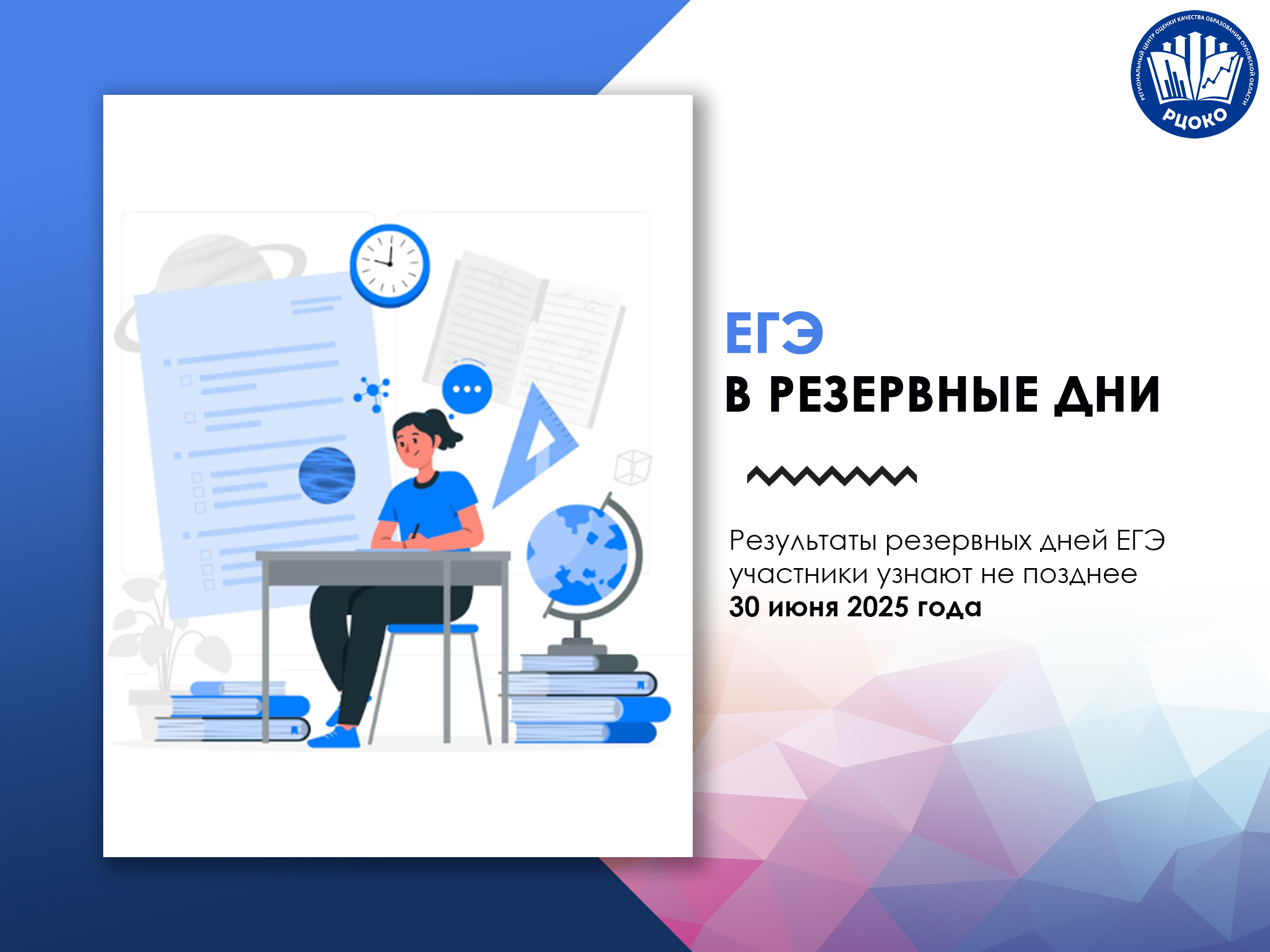 Расписанием экзаменов Рособрнадзора с 16 по 23 июня 2025 года предусмотрены резервные дни основного периода ЕГЭ по всем учебным предметам. В резервные дни экзаменов принимают участие выпускники прошлых лет, выпускники текущего года и обучающиеся профессиональных образовательных организаций, пропустившие экзамены в основные дни проведения ГИА, а также досрочно завершившие экзамен по объективным причинам, выпускники текущего года, получившие по одному из обязательных учебных предметов неудовлетворительный результат.