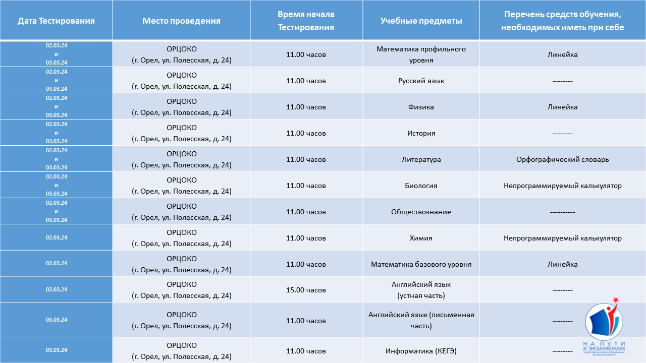 Вход в пункт проведения тренировочного тестирования будет начинаться за 45 минут до начала тестирования.