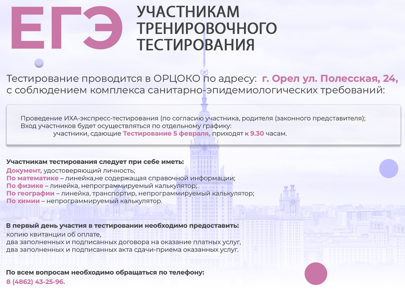 Напоминаем, что с 5 февраля 2022 года на базе Регионального центра оценки качества образования (далее — ОРЦОКО) проводится тренировочное тестирование для одиннадцатиклассников области.