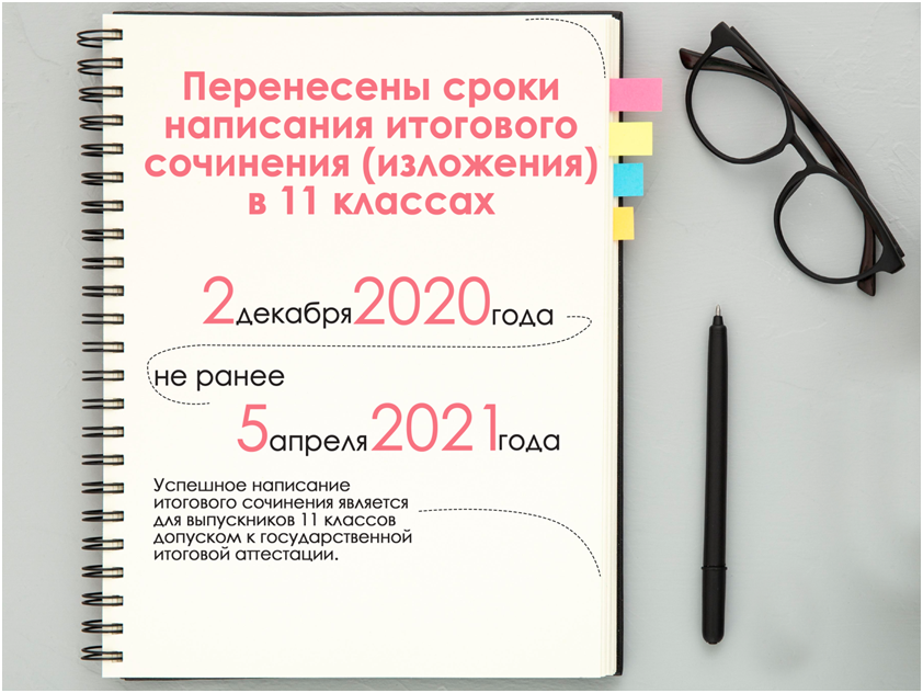 Проведение итогового сочинения (изложения) для выпускников 11 классов с 2 декабря 2020 будет перенесено в связи с неблагоприятной эпидемиологической ситуацией. Оно пройдет не ранее 5 апреля 2021 года. Такое решение согласовано Рособрнадзором и Минпросвещения России и одобрено на заседании Оперативного штаба по предупреждению завоза и распространения новой коронавирусной инфекции на территории Российской Федерации.