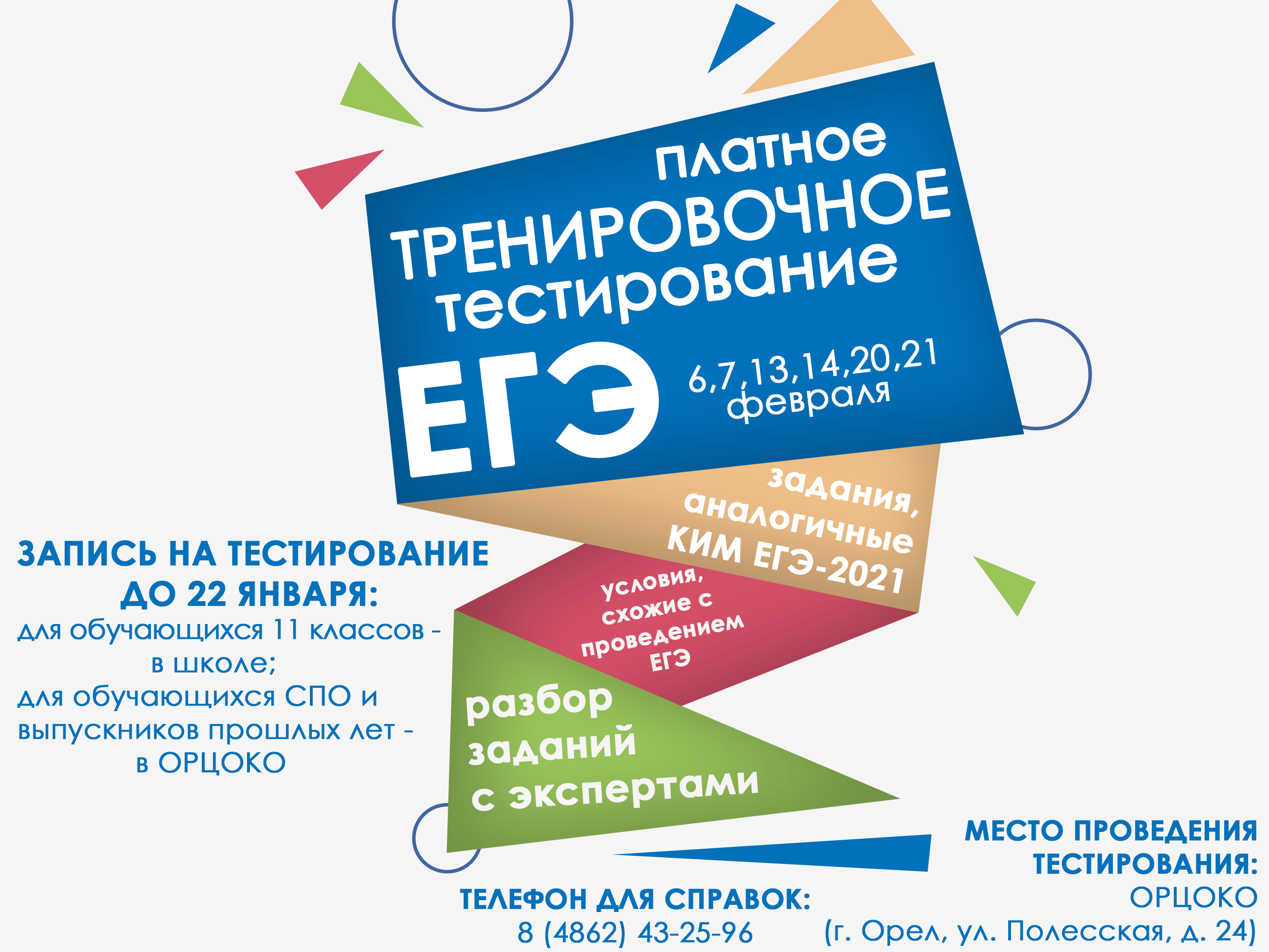 На базе Регионального центра оценки качества образования (ОРЦОКО) с 6 февраля по 21 февраля 2021 года пройдёт тренировочное тестирование для выпускников 11-х классов, обучающихся СПО и выпускников прошлых лет.