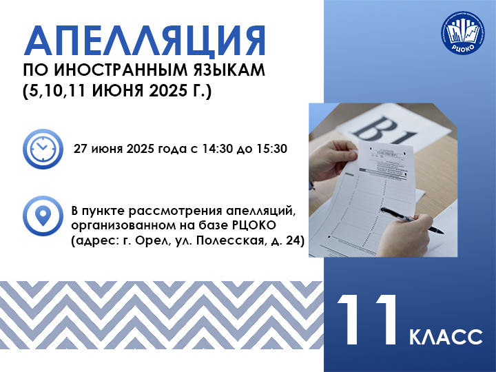 Рассмотрение апелляций по иностранным языкам будет проходить в пункте рассмотрения апелляций, организованном на базе РЦОКО (адрес: г. Орел, ул. Полесская, д. 24).