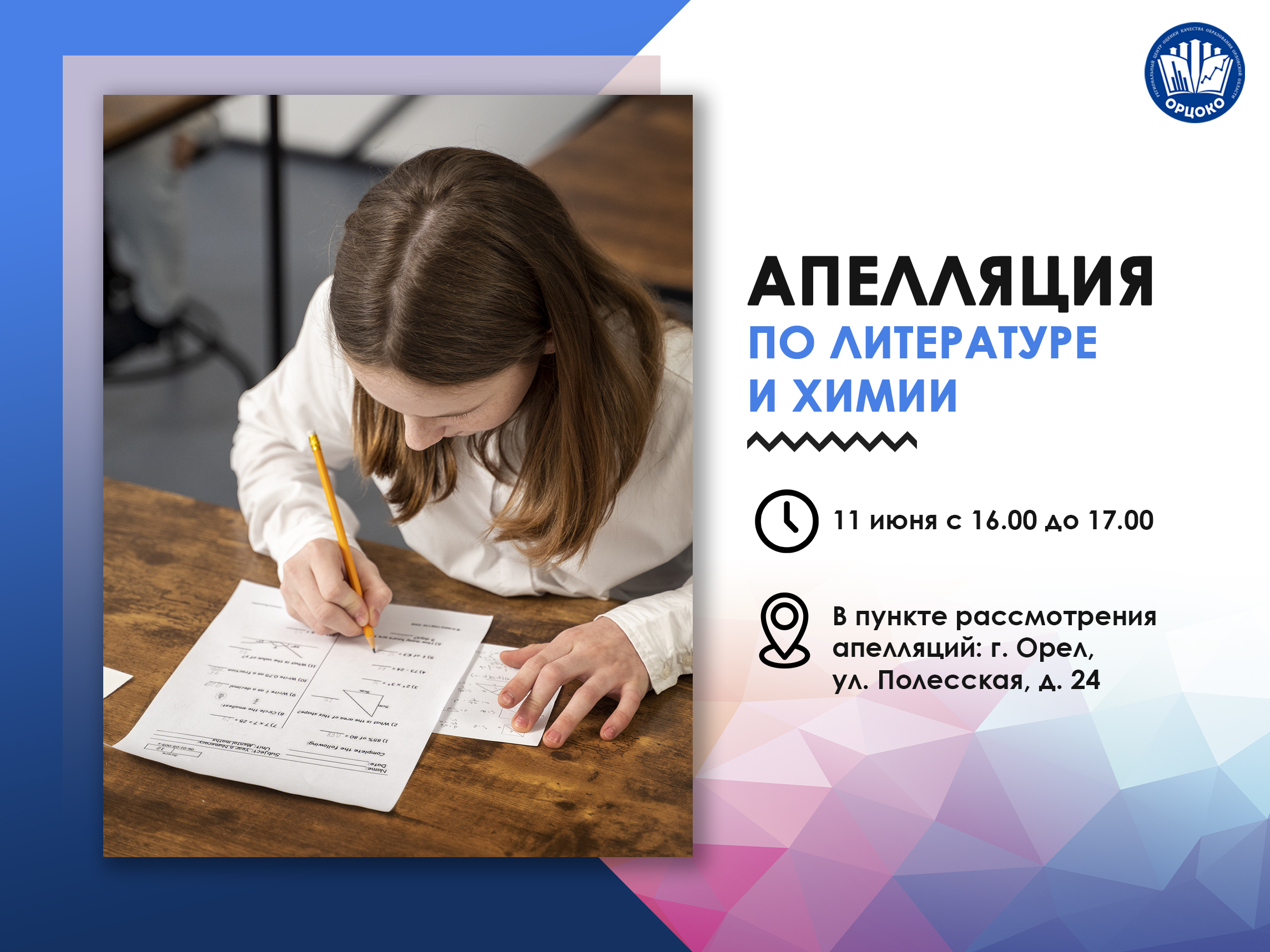 Апелляционная комиссия Орловской области информирует участников единого государственного экзамена о том, что рассмотрение апелляций о несогласии с выставленными баллами по литературе и химии (23.05.2024 г.) состоится 11 июня 2024 года с 16 ч 00 мин до 17 ч 00 мин.