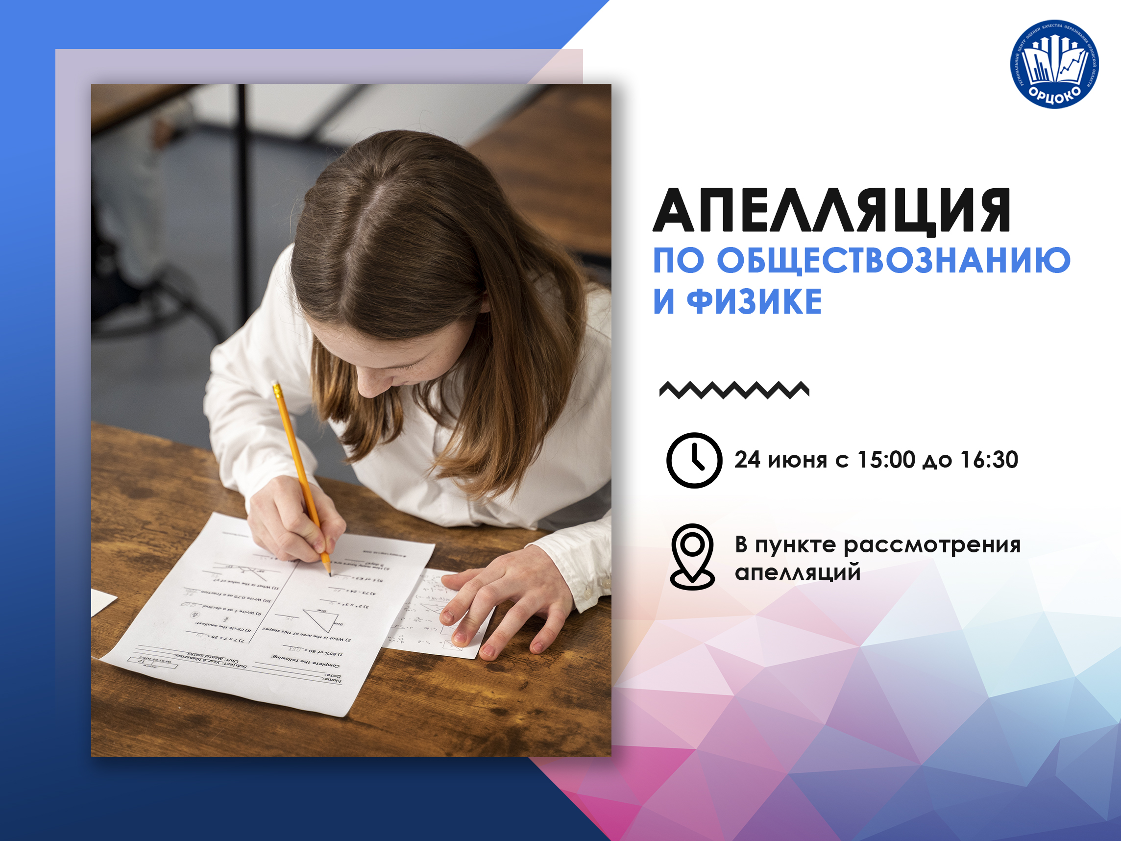 Апелляционная комиссия Орловской области информирует участников единого государственного экзамена и государственного выпускного экзамена о том, что рассмотрение апелляций о несогласии с выставленными баллами по обществознанию и физике (4 июня 2024 года) состоится 24 июня 2024 года с 15 ч 00 мин до 16 ч 30 мин.