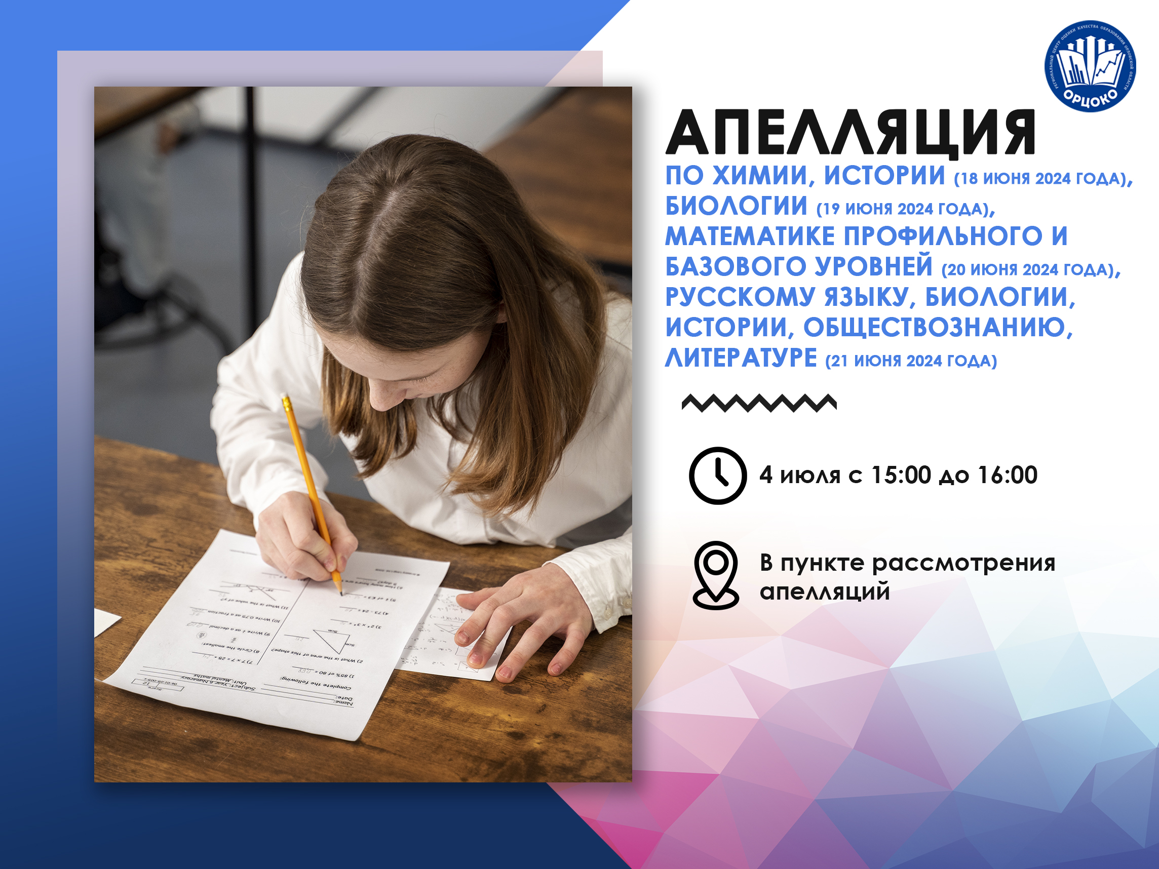 Апелляционная комиссия Орловской области информирует участников единого государственного экзамена и государственного выпускного экзамена о том, что рассмотрение апелляций о несогласии с выставленными баллами по химии, истории (18 июня 2024 года), биологии (19 июня 2024 года), математике профильного и базового уровней (20 июня 2024 года), русскому языку, биологии, истории, обществознанию, литературе (21 июня 2024 года) состоится 4 июля 2024 года с 15 ч 00 мин до 16 ч 00 мин.