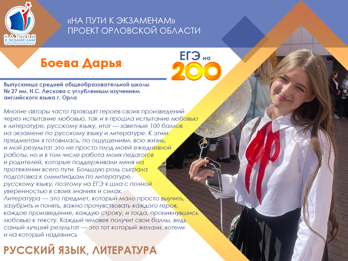 Выпускница школы № 27 г. Орла Дарья Боева рассказывает: «Многие авторы часто проводят героев своих произведений через испытание любовью, так и я прошла испытание любовью к литературе, русскому языку, итог — заветные 100 баллов на экзамене по русскому языку и литературе. К этим предметам я готовилась, по ощущениям, всю жизнь, и мой результат это не просто плод моей ежедневной работы, но и в том числе работа моих педагогов и родителей, которые поддерживали меня на протяжении всего пути. Большую роль сыграла подготовка к олимпиадам по литературе, русскому языку, поэтому на ЕГЭ я шла с полной уверенностью в своих знаниях и силах. Литература — это предмет, который мало просто выучить, зазубрить и понять, важно прочувствовать каждого героя, каждое произведение, каждую строку, и тогда, проникнувшись любовью к тексту, каждый человек получит свои баллы, ведь самый лучший результат — это тот который желали, хотели и на который надеялись».