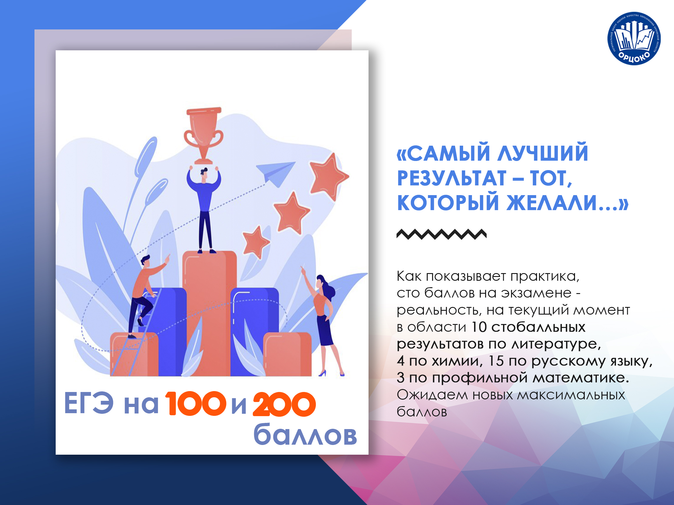 Как показывает практика, сто баллов на экзамене — реальность, на текущий момент в области 10 стобалльных результатов по литературе, 4 по химии, 15 по русскому языку, 3 по профильной математике. Ожидаем новых максимальных баллов.