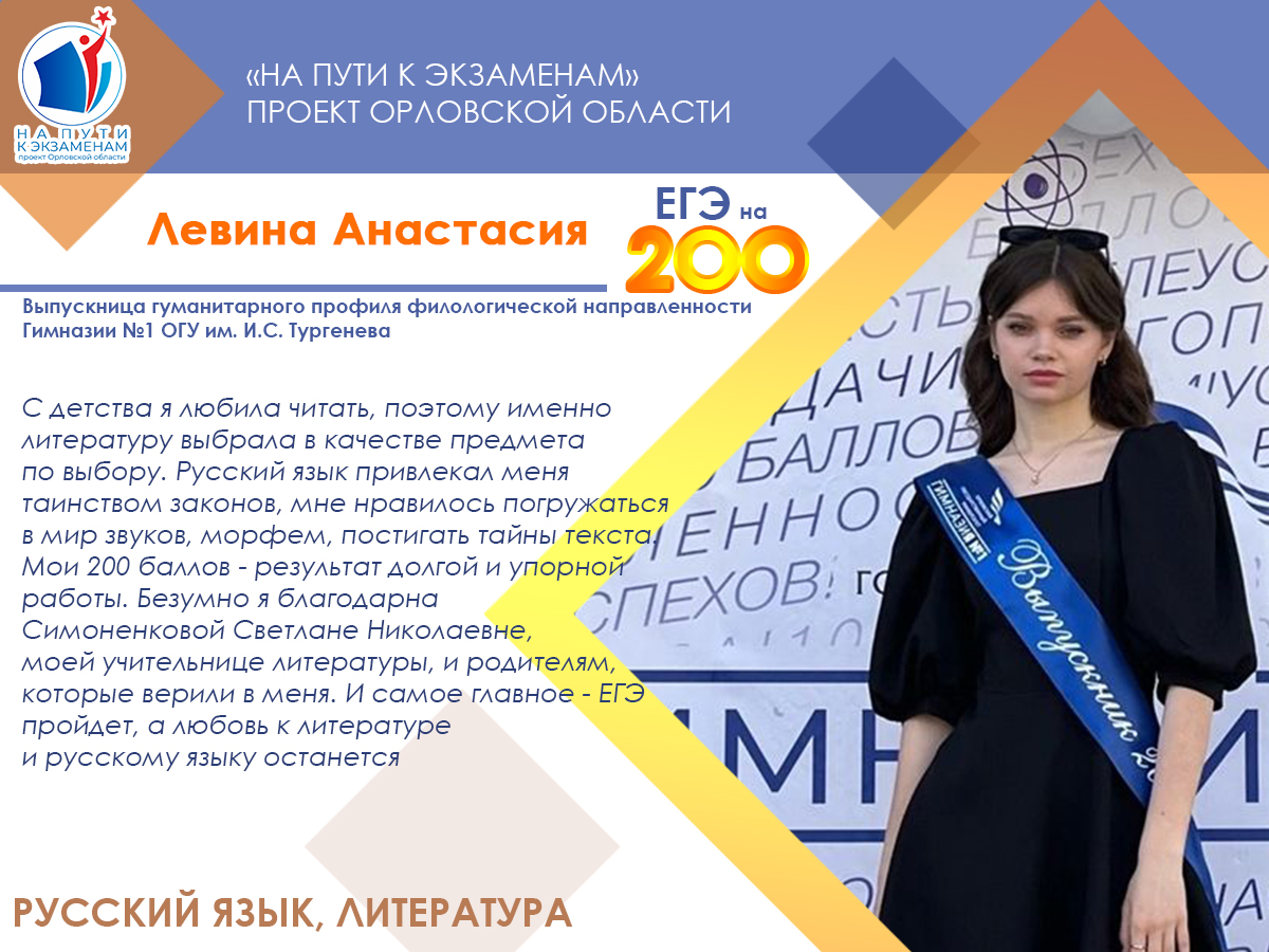 Левина Анастасия выпускница гуманитарного профиля филологической направленности Гимназии № 1 ОГУ им. И.С. Тургенева: «С детства я любила читать, поэтому именно литературу выбрала в качестве предмета по выбору. Русский язык привлекал меня таинством законов, мне нравилось погружаться в мир звуков, морфем, постигать тайны текста. Мои 200 баллов — результат долгой и упорной работы. Безумно я благодарна Симоненковой Светлане Николаевне, моей учительнице литературы, и родителям, которые верили в меня. И самое главное — ЕГЭ пройдет, а любовь к литературе и русскому языку останется».