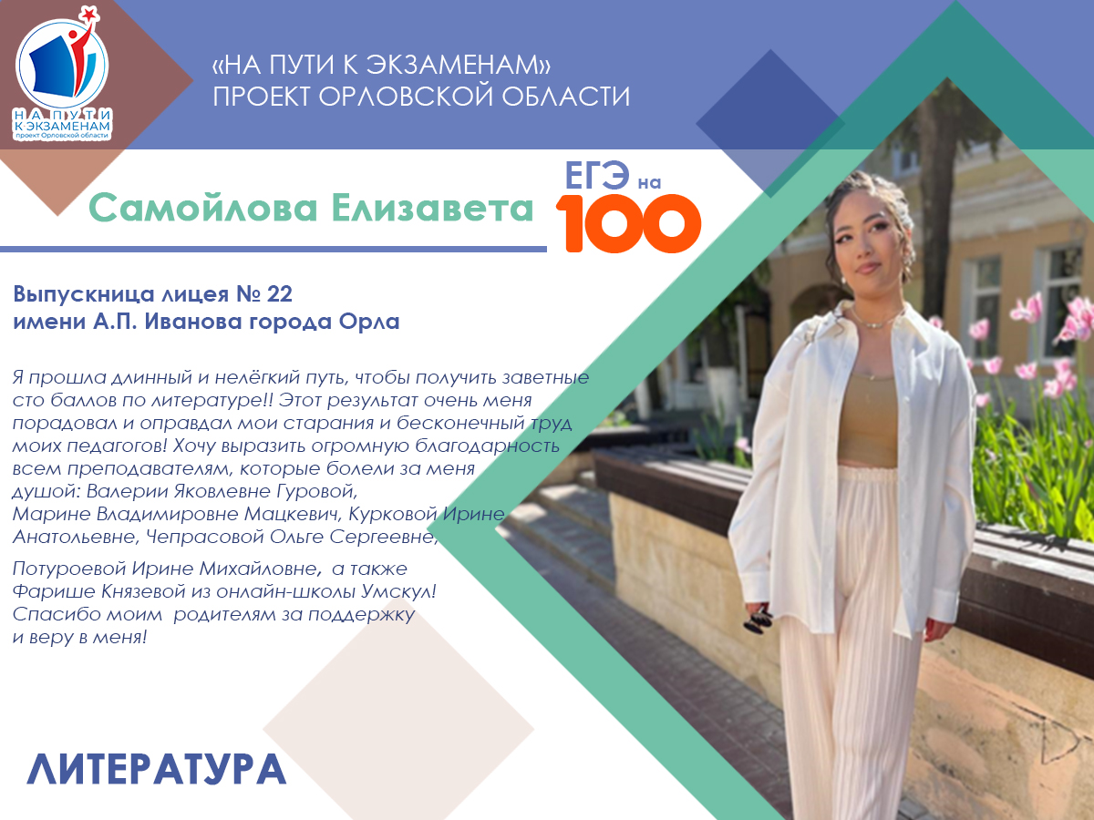 Сто баллов на экзамене — упорный труд. Именно так охарактеризовала Елизавета Самойлова, выпускница лицея № 22 имени А.П. Иванова города Орла, свой путь к «самому лучшему результату»: « Я прошла длинный и нелёгкий путь, чтобы получить заветные сто баллов по литературе!! Этот результат очень меня порадовал и оправдал мои старания и бесконечный труд моих педагогов!»