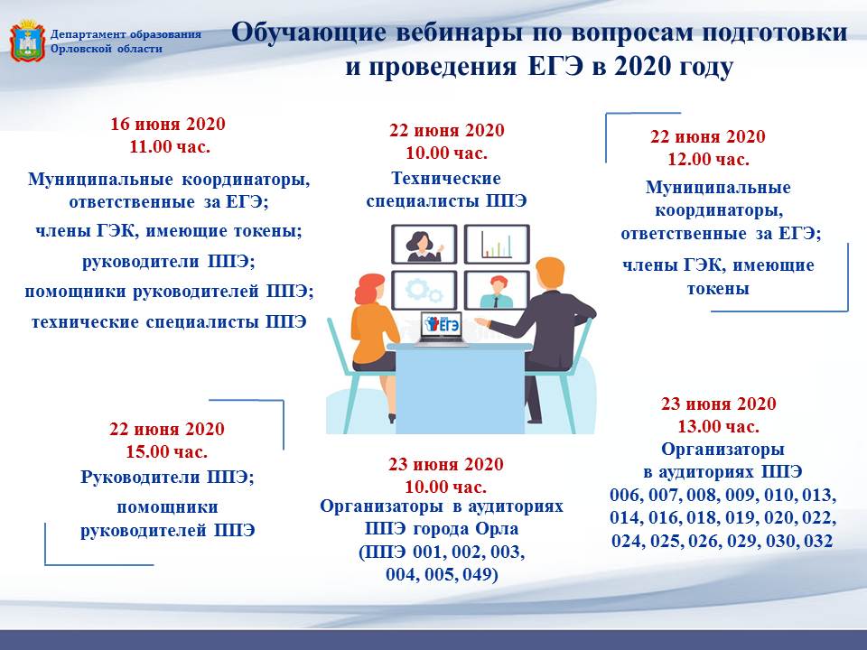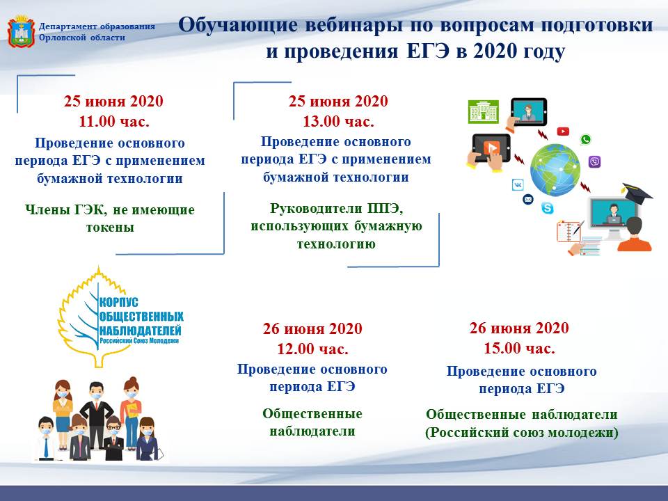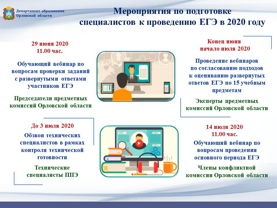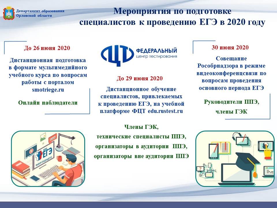 «В этом году проведение тренировочных мероприятий в целях определения организационной и технической готовности пунктов проведения экзаменов (ППЭ), организаторов ППЭ, привлекаемых специалистов (технических и медицинских работников), членов государственной экзаменационной комиссии к проведению единого государственного экзамена в Орловской области будет реализовано с 18 по 29 июня. Планируется отработать все механизмы организации проведения экзаменов с соблюдением соответствующих требований санитарно-эпидемиологических рекомендаций Роспотребнадзора в целях ограничения распространения коронавирусной инфекции», — подчеркнула Татьяна Крымова, член Правительства Орловской области — руководитель Департамента образования Орловской области.
