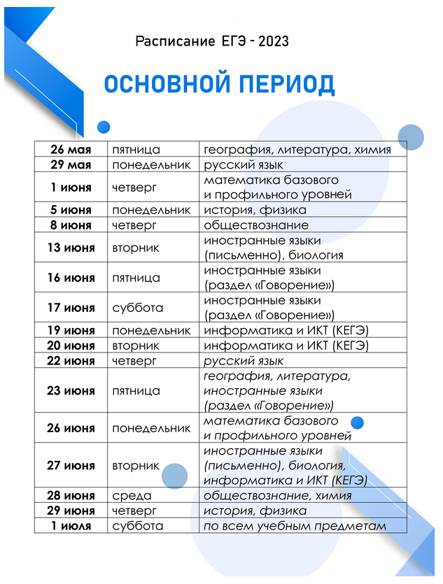В соответствии с документом, ЕГЭ в 2023 году в досрочный период пройдет с 20 марта по 19 апреля, в основной период – с 26 мая по 1 июля, в дополнительный период – с 6 по 19 сентября.