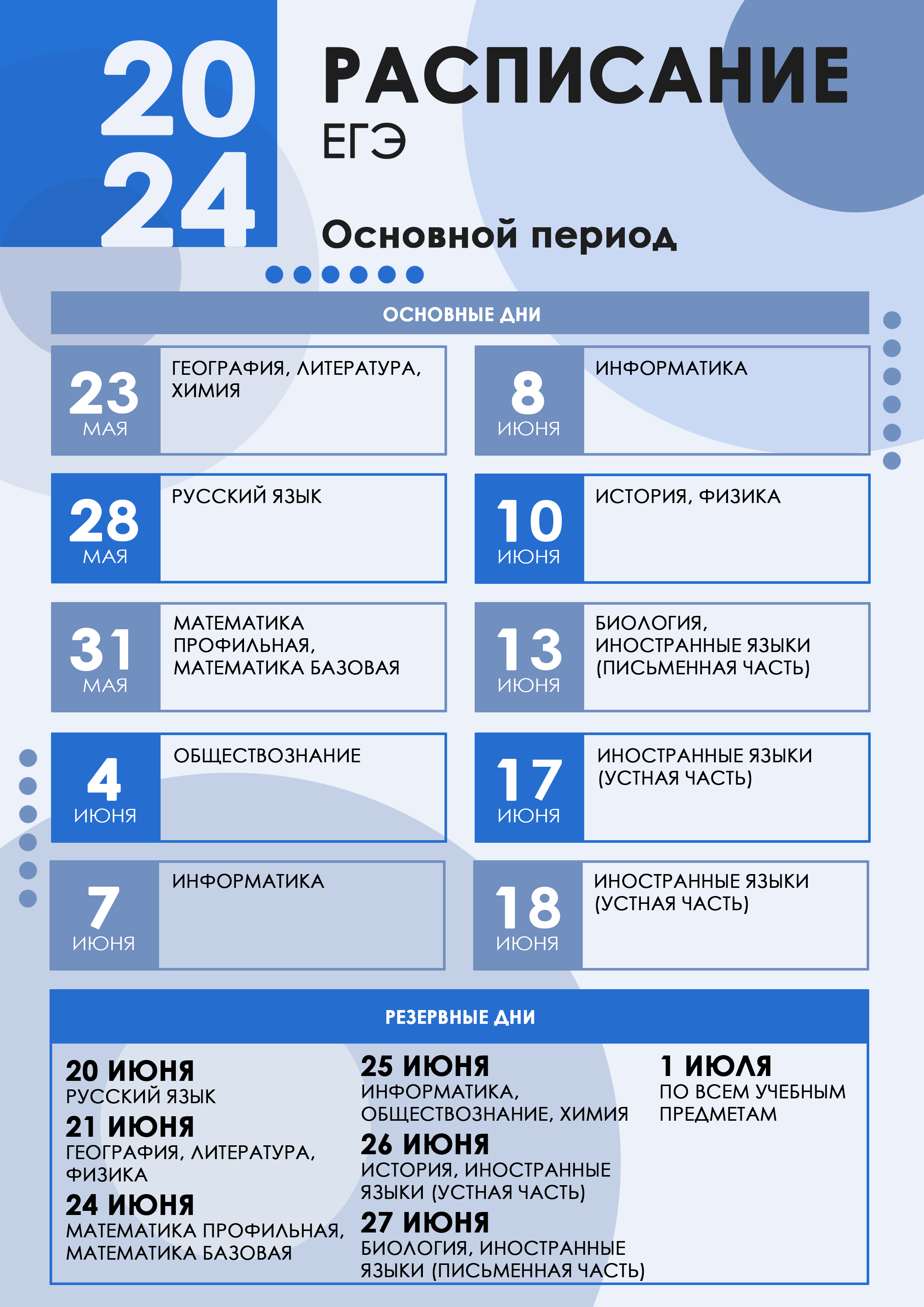 В соответствии с документом, ЕГЭ в 2024 году в досрочный период пройдет с 22 марта по 22 апреля, в основной период – с 23 мая по 1 июля, в дополнительный период – с 4 по 23 сентября.