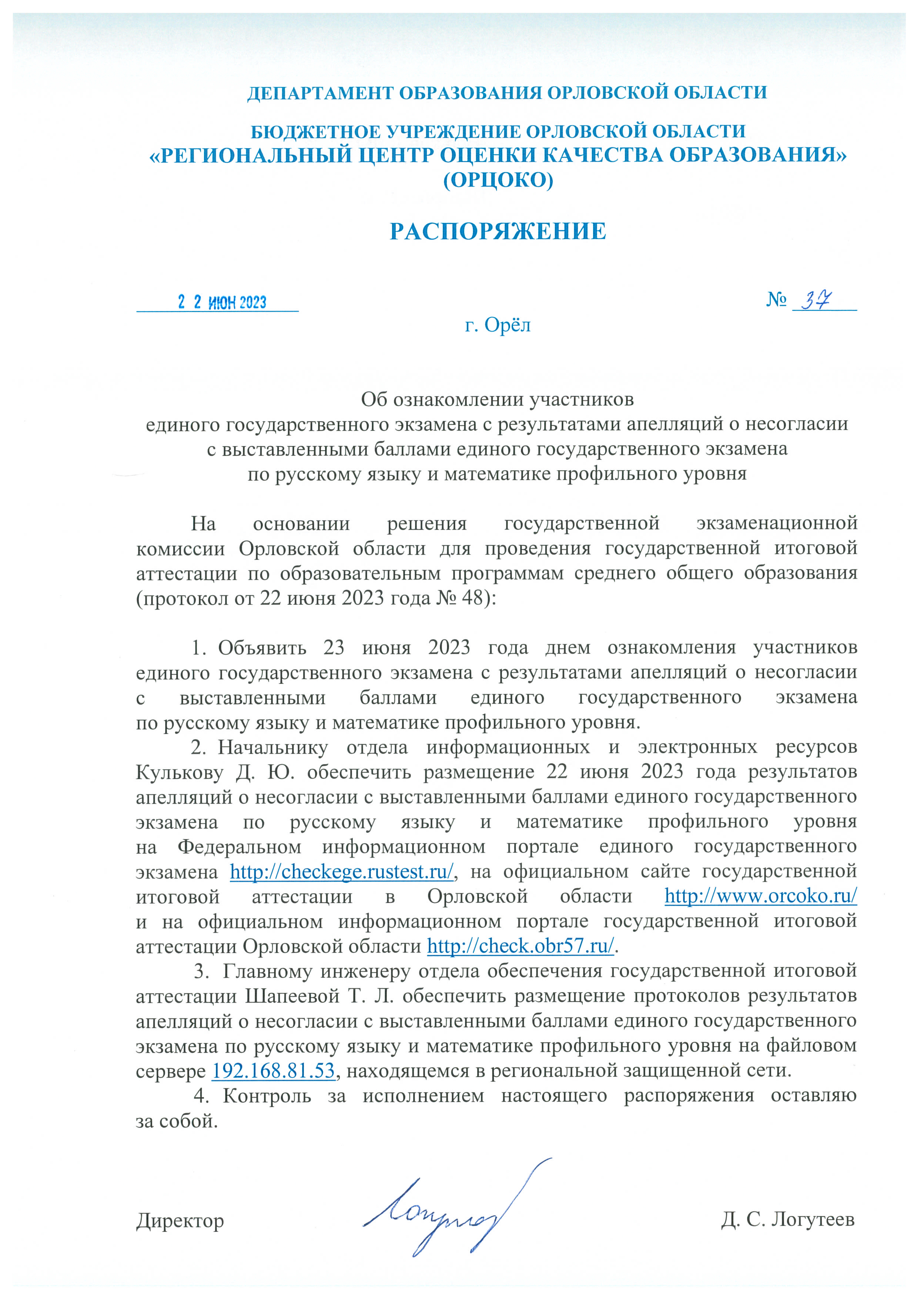 22 июня 2023 года государственная экзаменационная комиссия Орловской области для проведения государственной итоговой аттестации по образовательным программам среднего общего образования утвердила результаты апелляций о несогласии с выставленными баллами ЕГЭ по русскому языку (29.05.2023 г.) и математике профильного уровня (01.06.2023 г.).