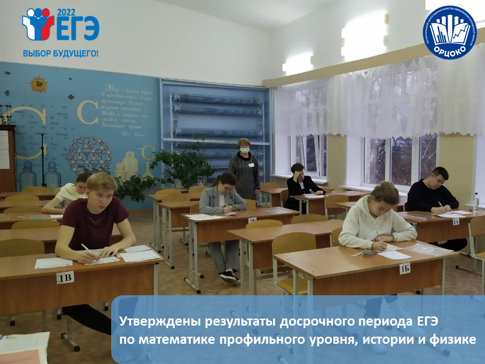 11 апреля 2022 года государственная экзаменационная комиссия Орловской области для проведения государственной итоговой аттестации по образовательным программам среднего общего образования утвердила результаты участников досрочного периода ЕГЭ по математике профильного уровня, истории и физике (28.03.2022 г., 31.03.2022 г.).
