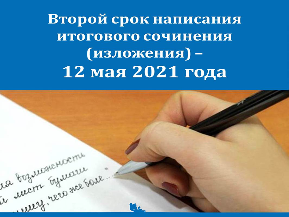 Второй срок проведения итогового сочинения (изложения), запланированный на 5 мая 2021 года, перенесен на 12 мая 2021 года. Все зарегистрированные участники на сочинение или изложение 5 мая 2021 года примут участие в его написании 12 мая 2021 года.