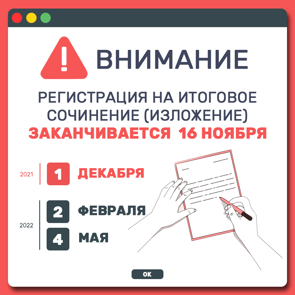 16 ноября 2021 года последний день подачи заявлений на участие в итоговом сочинении (изложении) которое будет проводиться 1 декабря 2021 года.