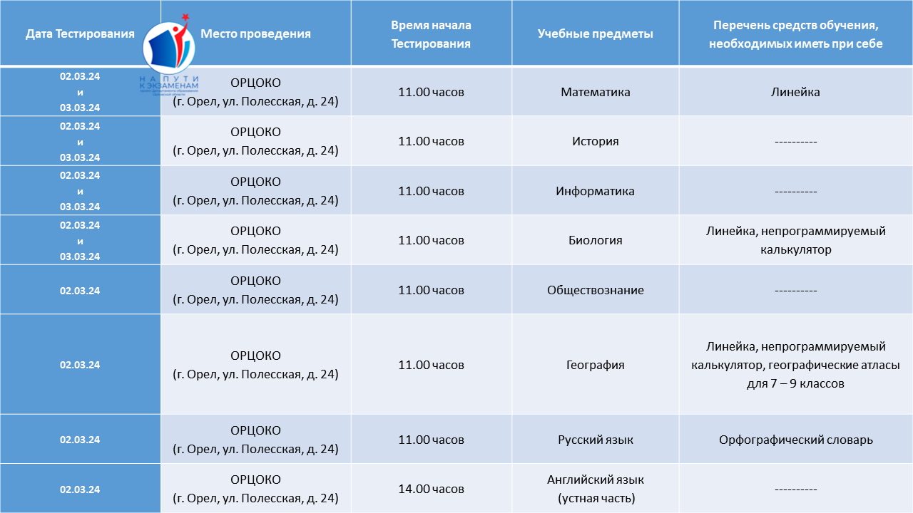 Вход в пункт проведения тренировочного тестирования будет начинаться за 45 минут до начала тестирования.