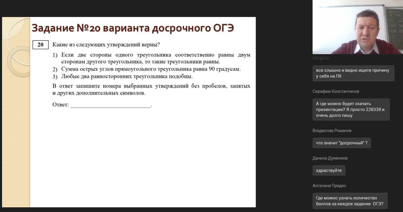 В завершении Александр Николаевич напомнил о заключительной онлайн консультации по математике, которая состоится 30 апреля 2020 года в 14.00 часов. Посвящена она будет разбору задач второй части КИМ ОГЭ.