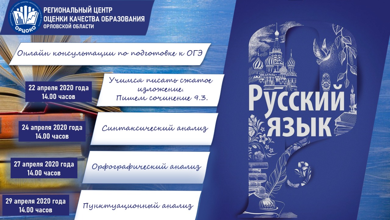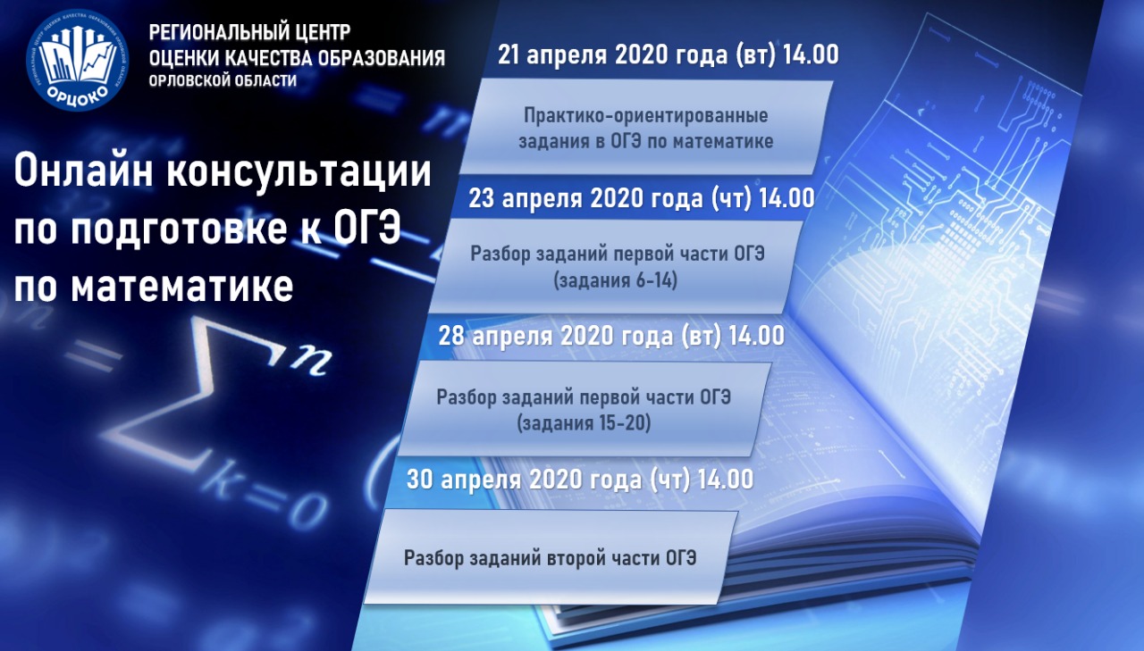 С 21 апреля по 30 апреля 2020 года Региональный центр оценки качества образования проводит серию онлайн консультаций по подготовке к государственной итоговой аттестации выпускников 9 классов. Ведущие консультаций — эксперты региональных предметных комиссий по русскому языку и математике.