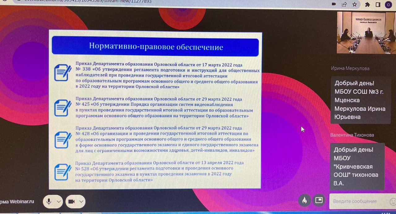 28 апреля 2022 года состоялся обучающий вебинар с общественными наблюдателями Ситуационно-информационного центра Орловской области. В ходе мероприятия участники обсудили вопросы организации общественного наблюдения при просмотре в режиме офлайн видеозаписей проведения государственной итоговой аттестации по образовательным программам основного общего образования (ГИА-9). Наблюдатели узнали, как функционирует региональный Ситуационно-информационный центр, как осуществляется наблюдение, а также какие типы нарушений существуют.
