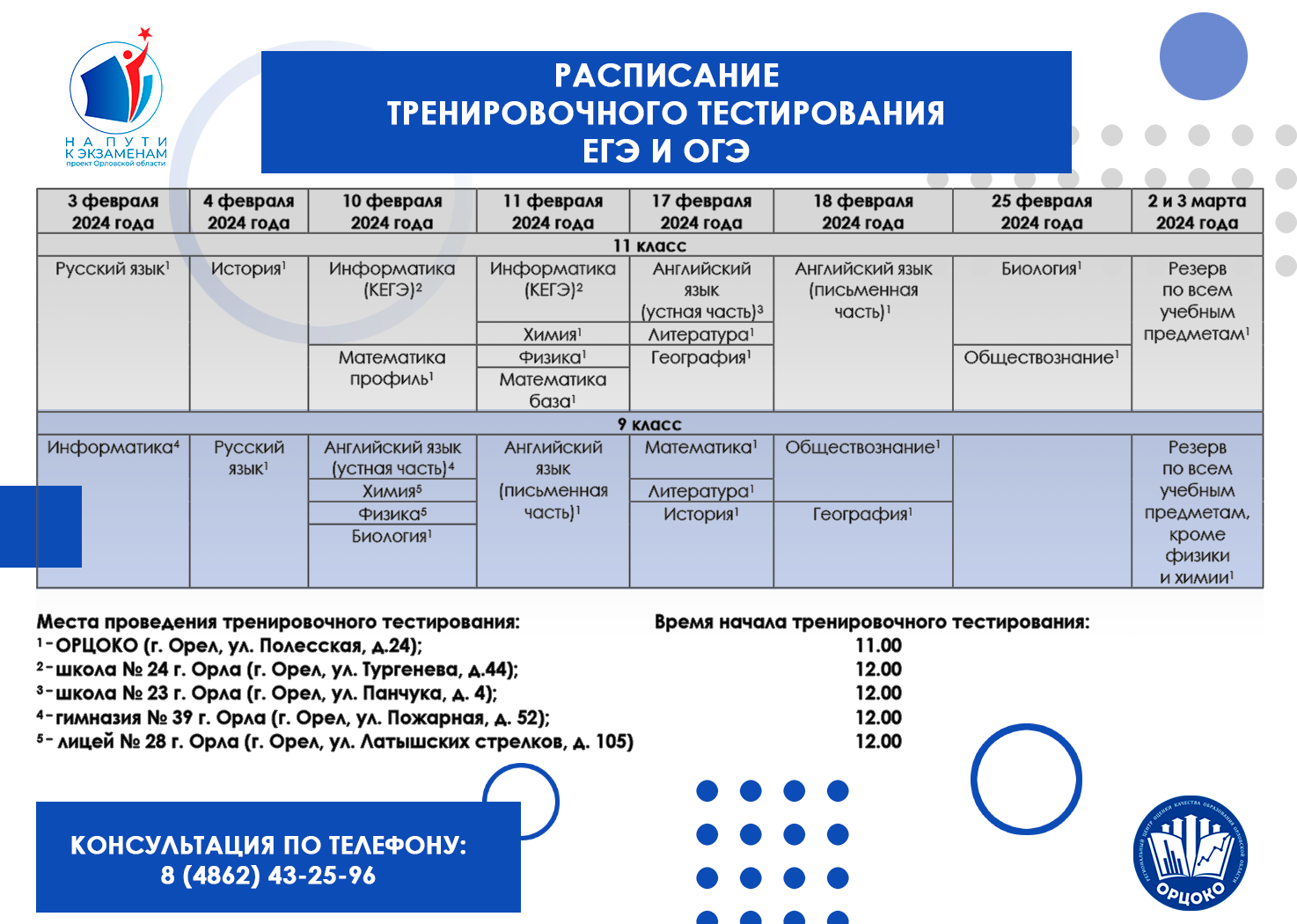 Пунктом проведения Тренировочного тестирования является ОРЦОКО (г. Орел, ул. Полесская, д.24).