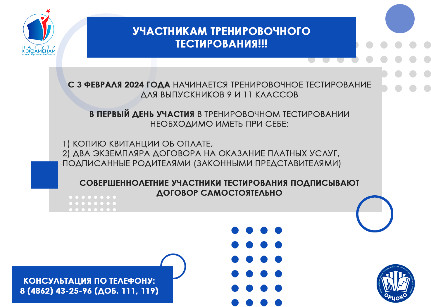 В первый день участия в тренировочном тестировании необходимо иметь при себе копию квитанции об оплате, два экземпляра договора на оказание платных услуг, подписанные родителями (законными представителями). Совершеннолетние участники тестирования подписывают договор самостоятельно.