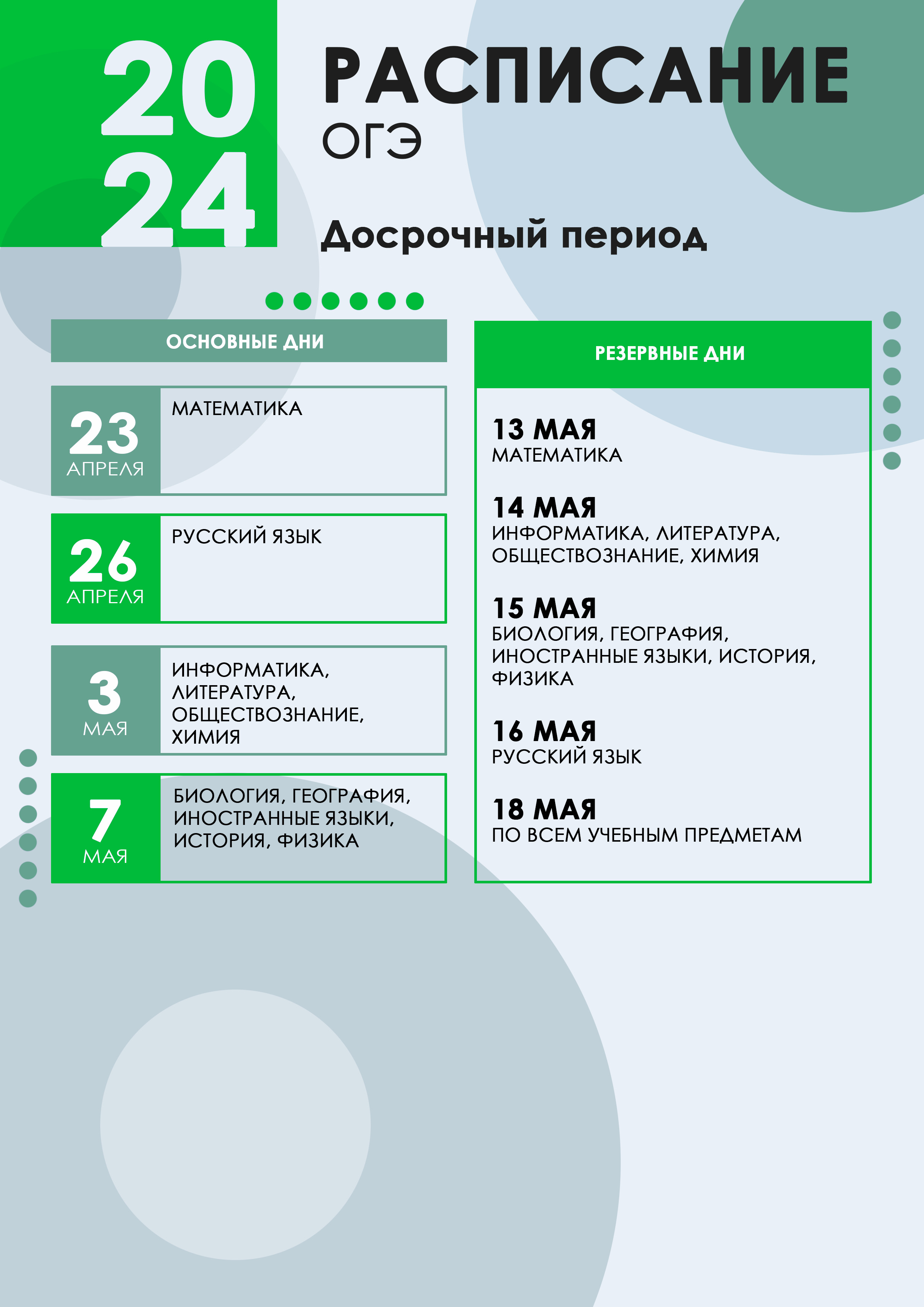 Согласно приказу, досрочный период ОГЭ пройдет с 23 апреля по 18 мая 2024 года для выпускников, которые не смогут принять участие в экзаменах в основной период, основной период – с 21 мая по 2 июля 2024 года.