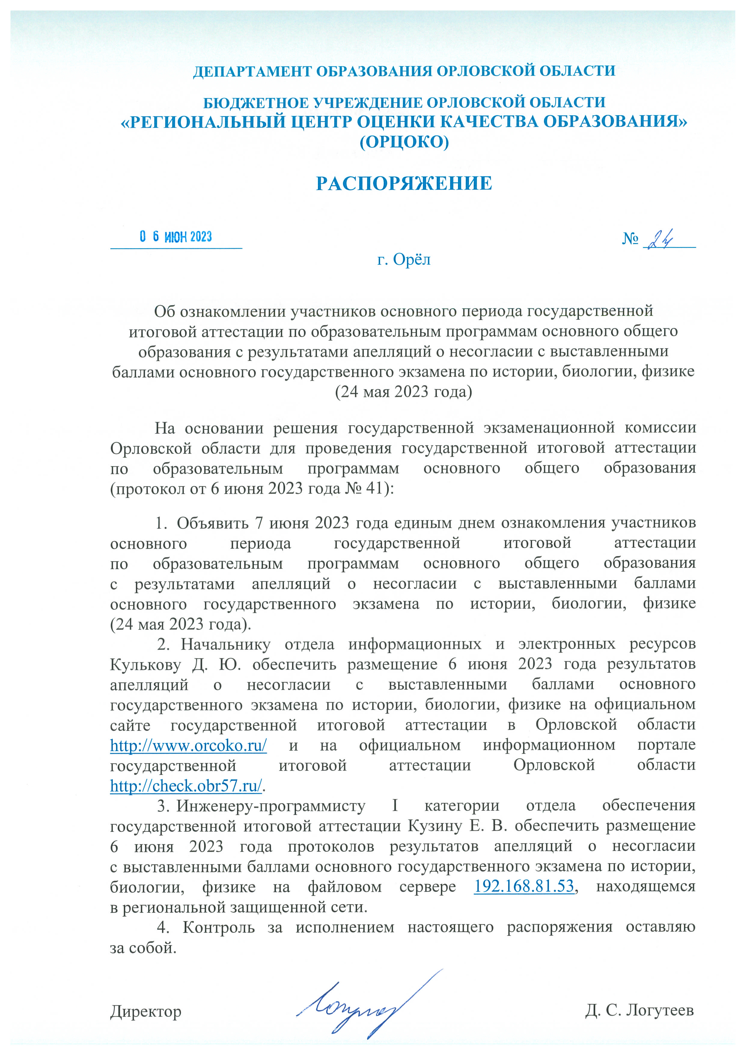 6 июня 2023 года государственная экзаменационная комиссия Орловской области для проведения государственной итоговой аттестации по образовательным программам основного общего образования утвердила результаты апелляций о несогласии с выставленными баллами основного государственного экзамена по истории, биологии, физике (24 мая 2023 года).