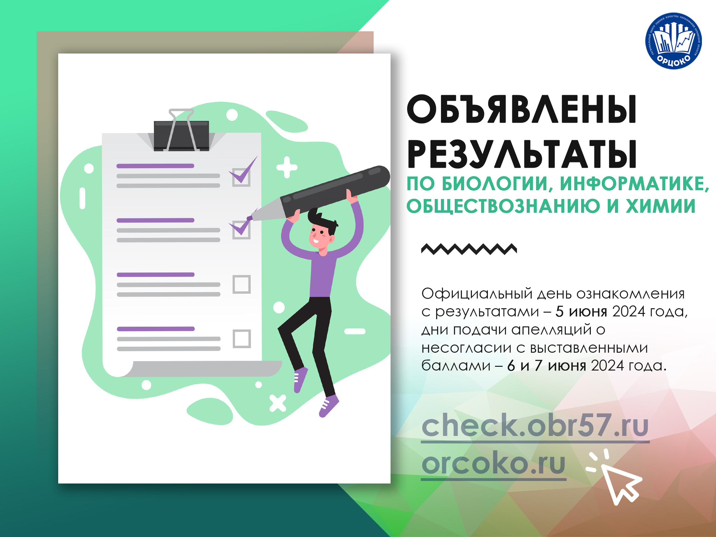 4 июня 2024 года государственная экзаменационная комиссия Орловской области для проведения государственной итоговой аттестации по образовательным программам основного общего образования утвердила результаты участников основных дней основного периода ОГЭ по биологии, информатике, обществознанию и химии (27 мая 2024 года).