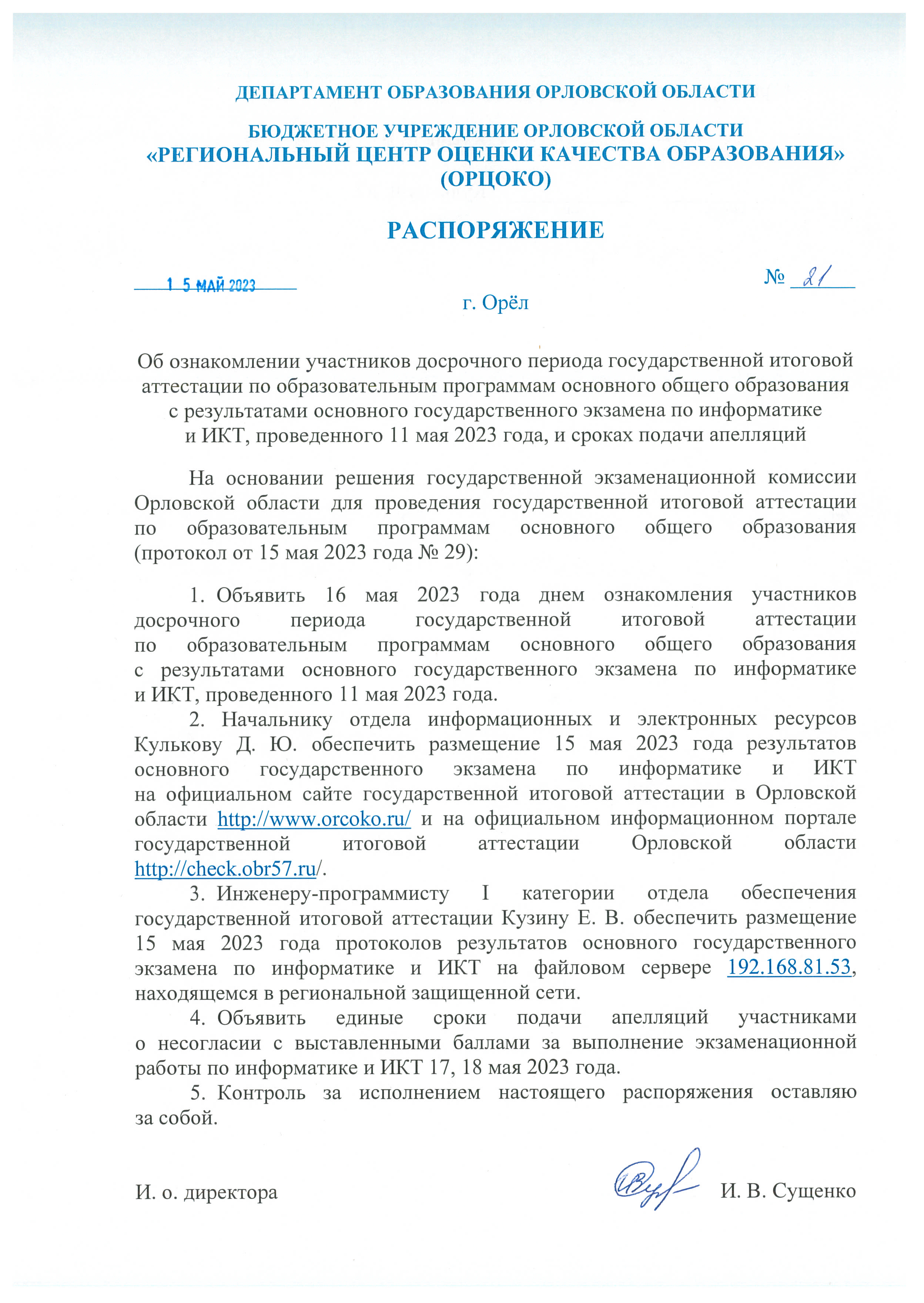 15 мая 2023 года государственная экзаменационная комиссия Орловской области для проведения государственной итоговой аттестации по образовательным программам основного общего образования утвердила результаты участников досрочного периода ОГЭ по информатике и ИКТ (11 мая 2023 года).