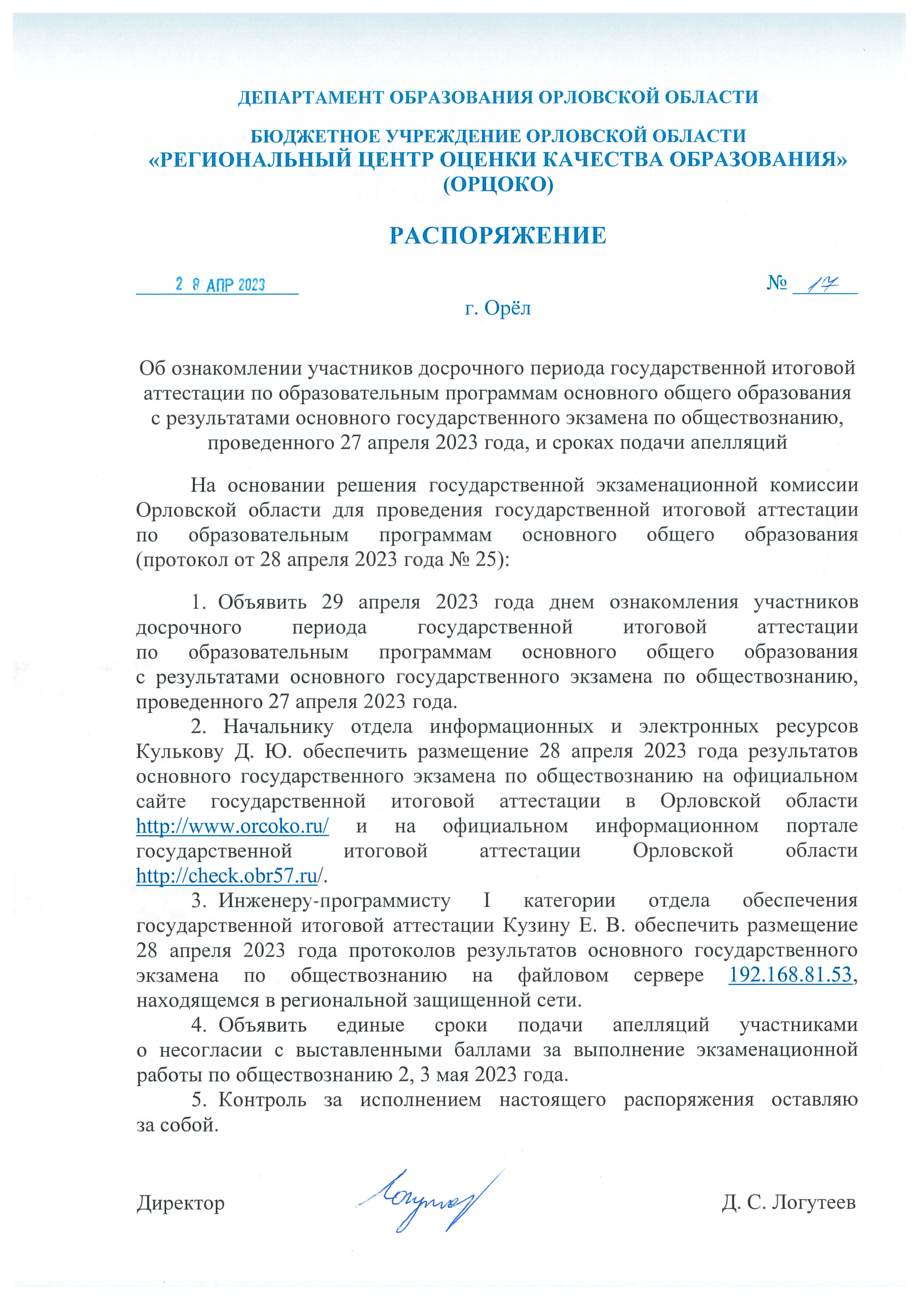 28 апреля 2023 года государственная экзаменационная комиссия Орловской области для проведения государственной итоговой аттестации по образовательным программам основного общего образования утвердила результаты участников досрочного периода ОГЭ по обществознанию (27 апреля 2023 года).