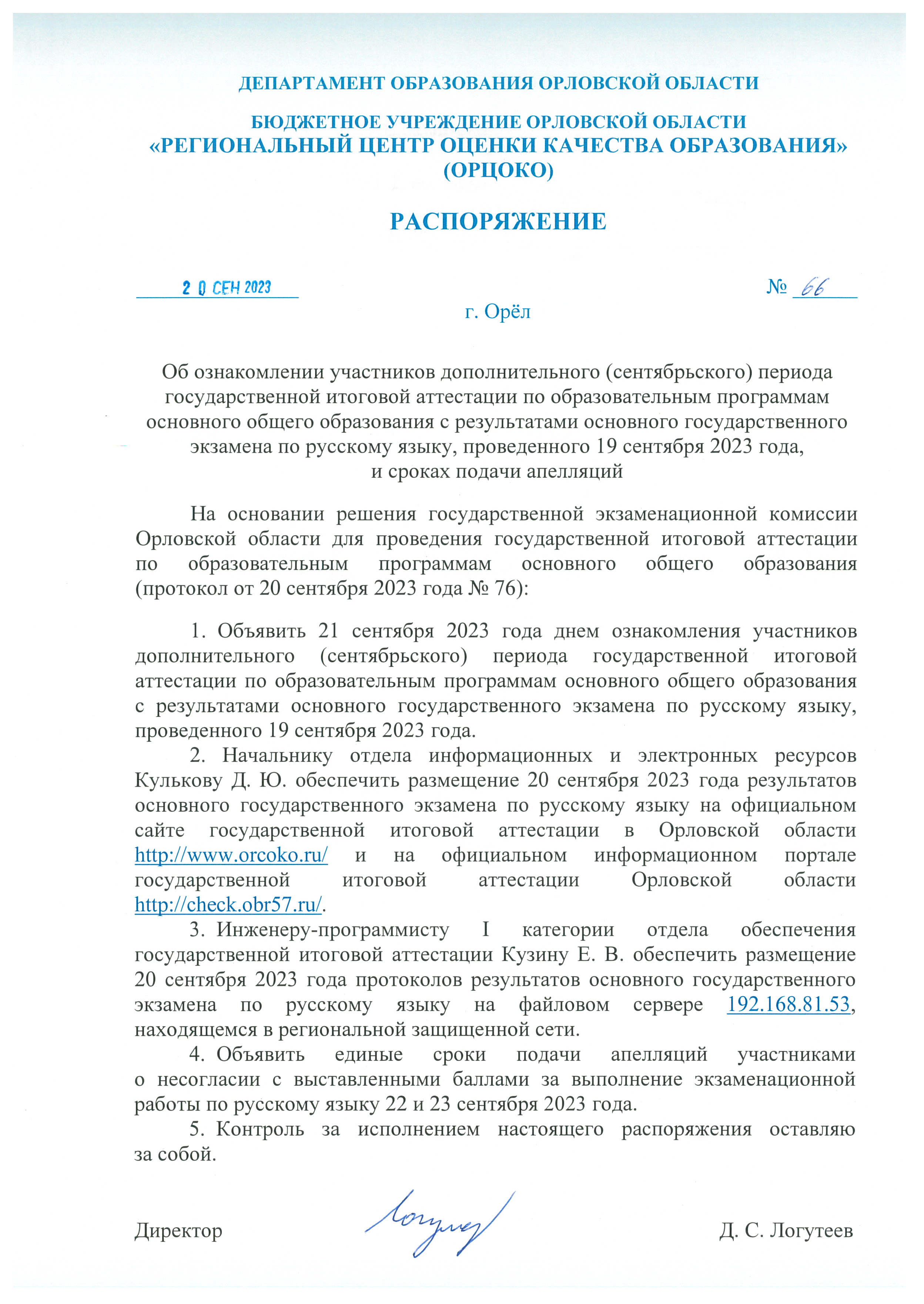 20 сентября 2023 года государственная экзаменационная комиссия Орловской области для проведения государственной итоговой аттестации по образовательным программам основного общего образования утвердила результаты участников дополнительного (сентябрьского) периода ОГЭ по русскому языку (19 сентября 2023 года).