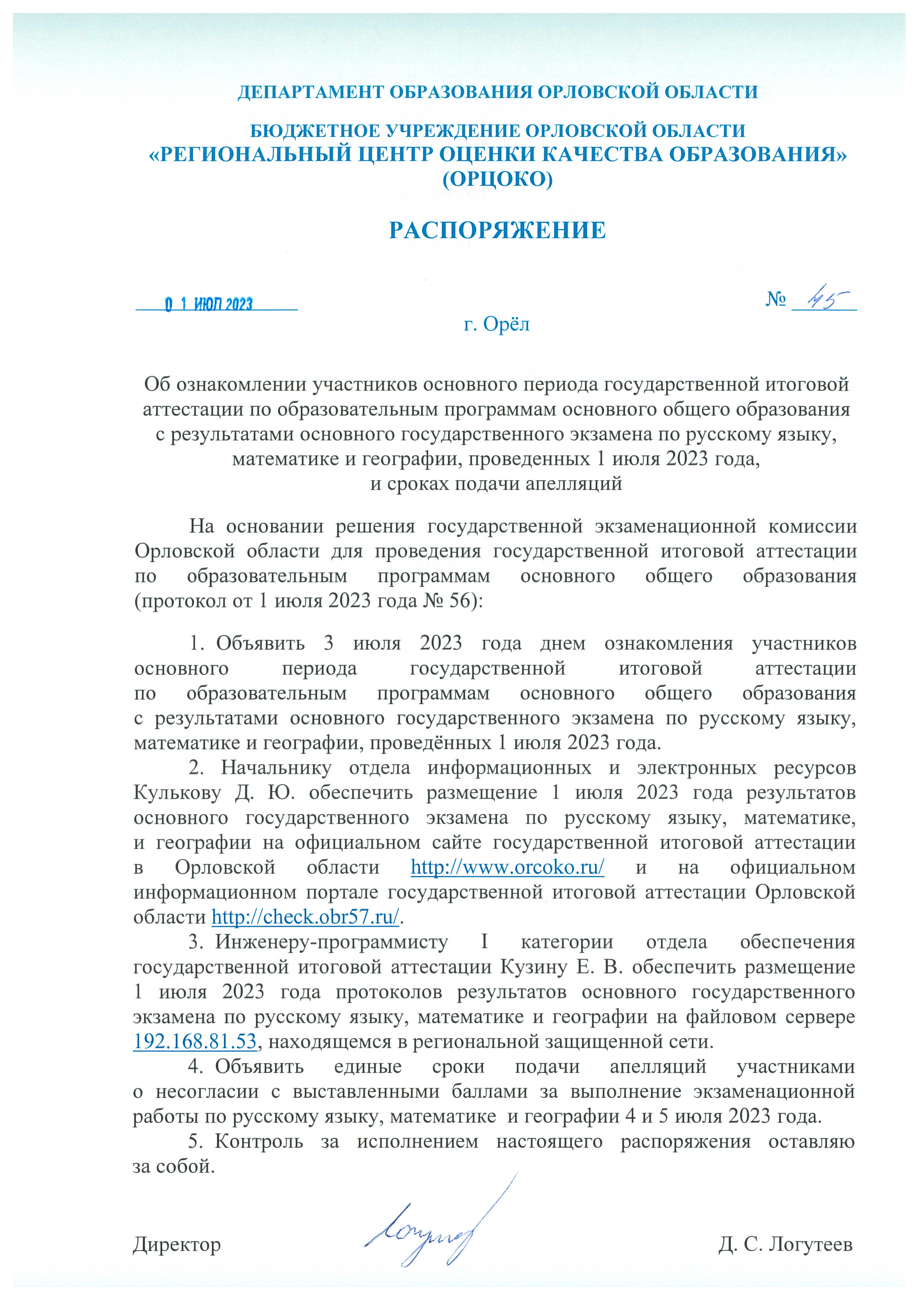 1 июля 2023 года государственная экзаменационная комиссия Орловской области для проведения государственной итоговой аттестации по образовательным программам основного общего образования утвердила результаты участников резервного дня основного периода ОГЭ по русскому языку, математике и географии (1 июля 2023 года).