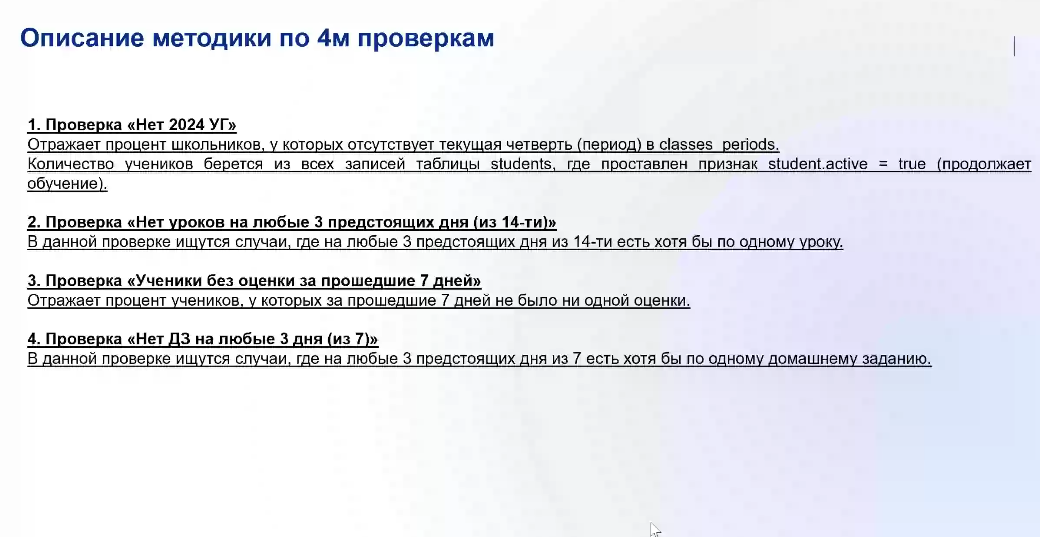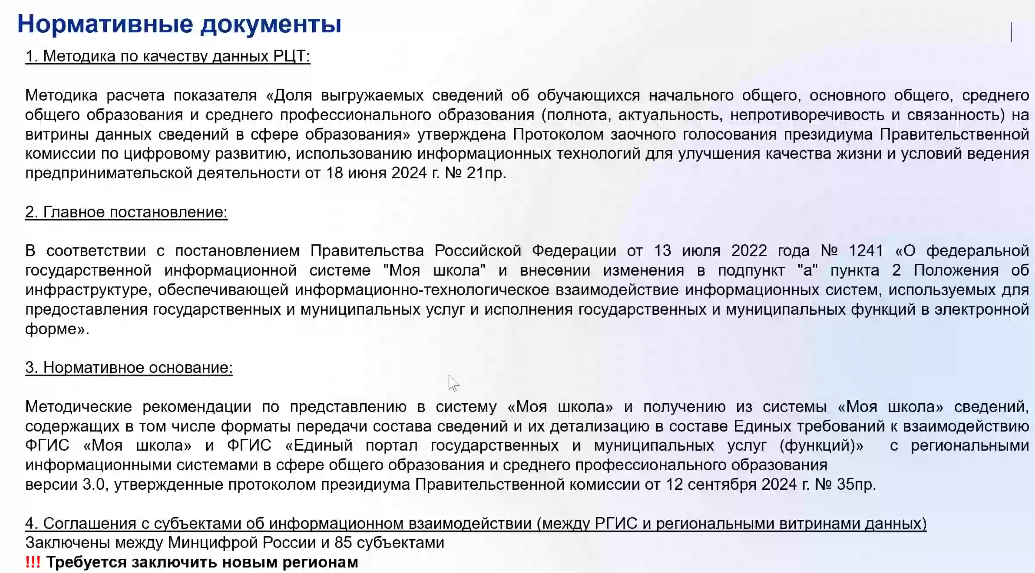 В ходе мероприятия были представлены постановление Правительства Российской Федерации, нормативное основание и методика расчета показателей качества данных (данные о посещаемости, успеваемости, домашних заданий обучающихся).