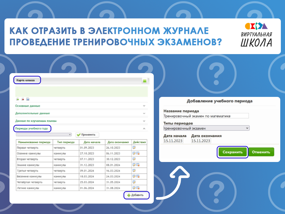 В карте класса, который пишет репетиционный экзамен, в разделе «Периоды учебного года» необходимо выставить Тип учебного периода «Тренировочный экзамен», указать название периода, дату начала и окончания периода.