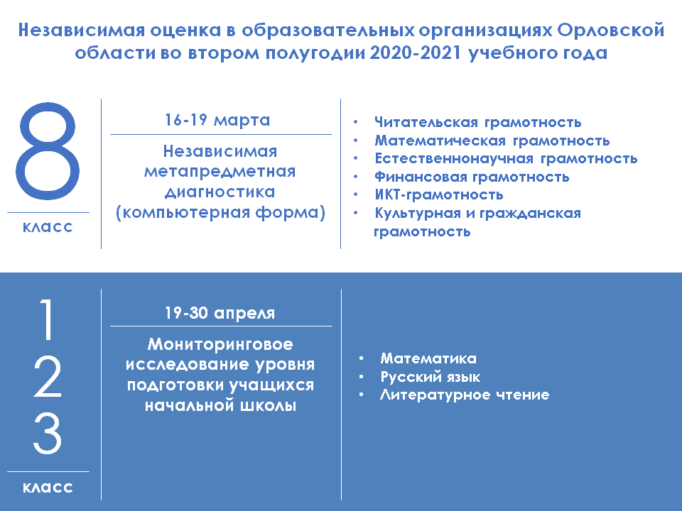 Осенью 2021 года пятнадцатилетние школьники Орловской области примут участие в оценке по модели PISA. Возможность проверить свои силы будет предоставлена восьмиклассникам орловских школ с 16 по 19 марта 2021 года: для будущих участников с целью получения комплексной оценки образовательных достижений обучающихся в соответствии с ФГОС запланирована метапредметная диагностика, которая будет проводится по шести направлениям. Метапредметная диагностика пройдет в компьютерной форме. В течение 60 минут восьмиклассники выполнят задания, которые позволят получить оценку читательской, математической, естественнонаучной, финансовой, компьютерной, культурной и гражданской грамотности школьников.