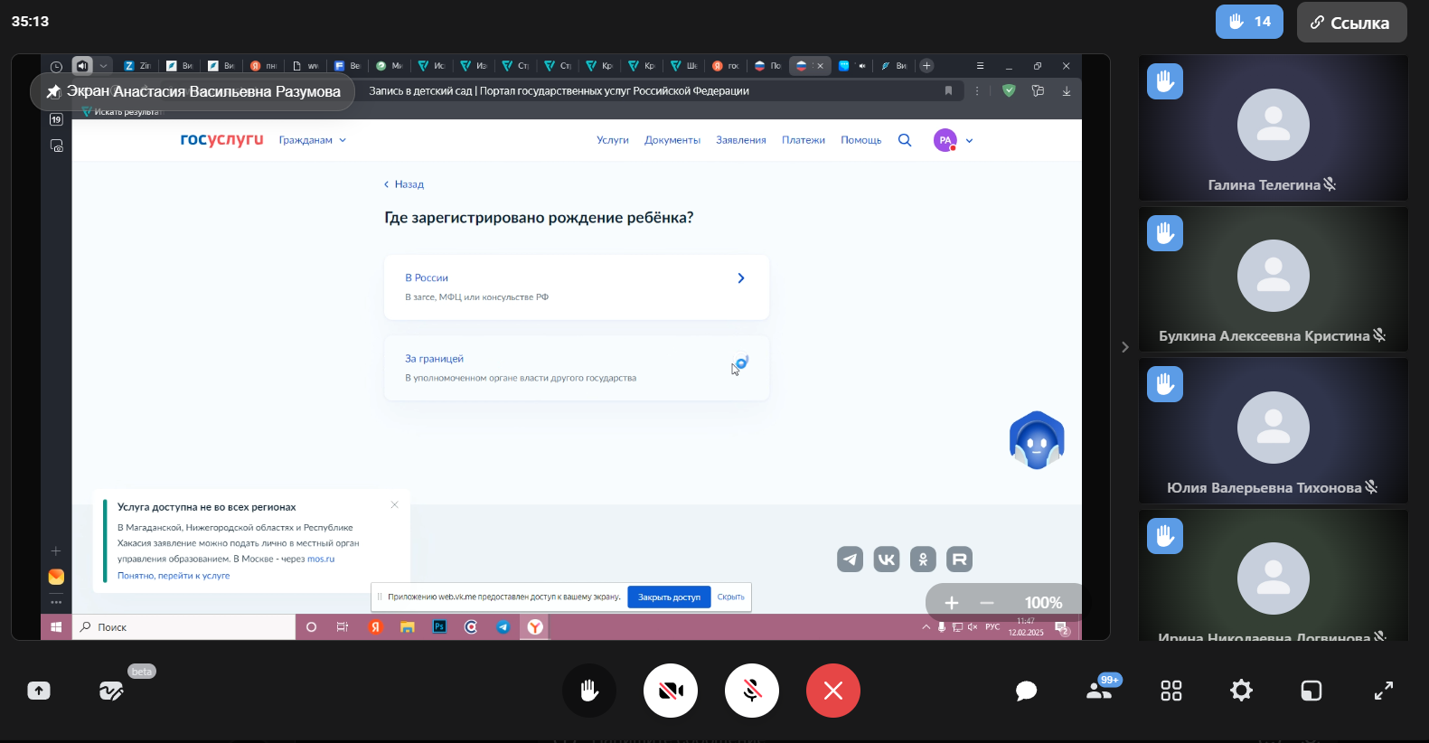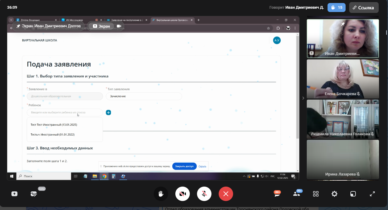 Батурина Олеся Евгеньевна, главный инженер отдела цифровой трансформации в сфере образования, показала работу оператора в информационной системе образовательных услуг «Виртуальная школа» при составлении заявления на зачисление в дошкольную образовательную организацию. А также работу с новой статусной моделью при обработке заявлений такого типа.