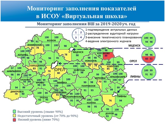 Накануне был проведен итоговый Мониторинг заполнения показателей в ИСОУ «Виртуальная школа» за 2019-2020 учебный год, результаты которого оказались очень успешными. В «зелёной» зоне (свыше 90%) по всем показателям представлены 14 муниципалитетов: Болховский, Свердловский, Хотынецкий, Краснозоренский, Кромской, Залегощенский, Колпнянский, Троснянский Шаблыкинский, Сосковский, Покровский, Должанский, города Мценск и Ливны. Это говорит о том, что образовательные организации начали усиленно и основательно работать в системе. Высокий процент заполнения показывает высокий уровень освоения функционала системы, знания виджетов и особенностей ведения образовательного процесса в системе. Что очень радует, ведь впереди нас ждет переход на электронный документооборот.